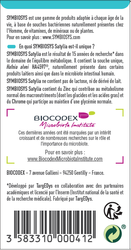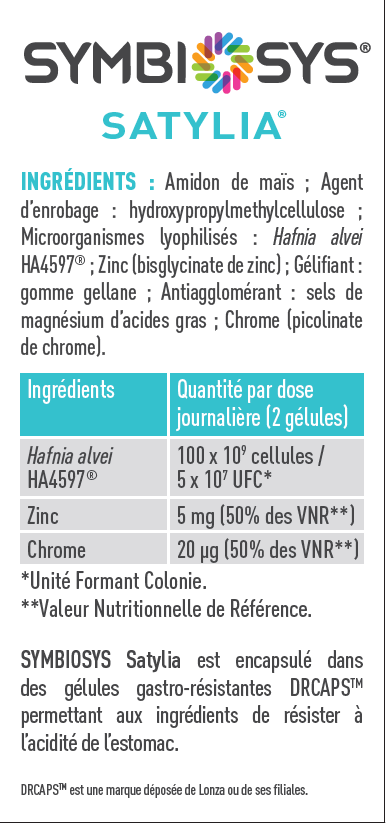 Mon allié en complément d’une alimentation équilibrée. complément alimentaire à base d’une souche microbiotique unique hafnia alvei ha4597®, de chrome et de zinc. le chrome et le zinc contribuent au métabolisme normal des macronutriments. symbiosys satylia® est le résultat de 15 années de recherche* dans le domaine de l’équilibre métabolique. * développé par targedys en collaboration avec des partenaires académiques et licencié par l’inserm (institut national de la santé et de la recherche médicale).