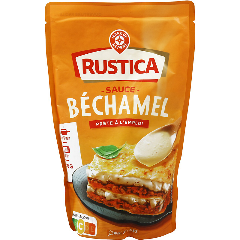 Ingrédients : Eau, lait entier 40 %, crème fraîche 5 %, farine de blé 2 %, amidon modifié de maïs, sel, épaississant : gomme xanthane, muscade, beurre 0,1 %, poivre.