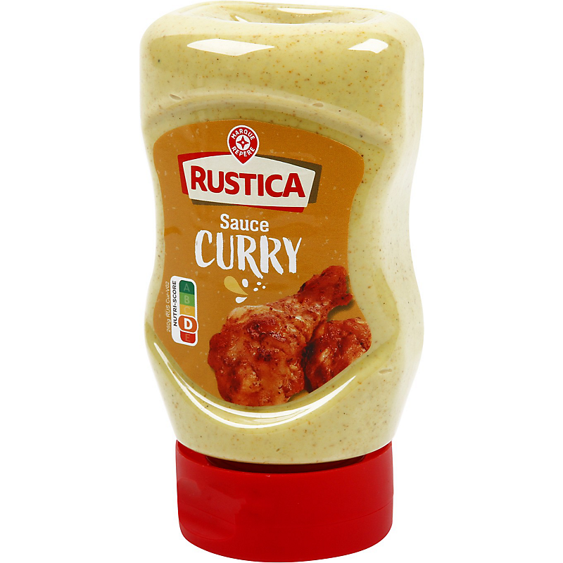 Ingrédients: Eau, huile de colza, vinaigre d'alcool, sucre, amidon modifié de maïs, sel, curry 2 % (coriandre, fenugrec, curcuma, piment, poivre, sel, fenouil), jaune d'œuf, jus de citron concentré, épaississant : gomme xanthane, curcuma en poudre, arôme naturel de fenugrec, conservateur : E202.