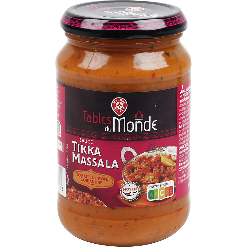 Ingrédients: Eau, tomates pelées concassées (tomates, affermissant : chlorure de calcium, acidifiant : acide citrique) 17,1 %, oignons, huile de colza, double concentré de tomates 4,6 %, sucre, amidon modifié de maïs, protéines de lait, purée de gingembre, épices 1,5 % (dont coriandre 0,3 %), lait fermenté en poudre 1,4 %, huile de coco, jus de citron concentré 0,9 %, sel, crème en poudre, acidifiant : acide lactique, feuille de coriandre 0,2 %, piment rouge, arôme, colorant : extrait de paprika, fenugrec, arôme naturel d'ail.