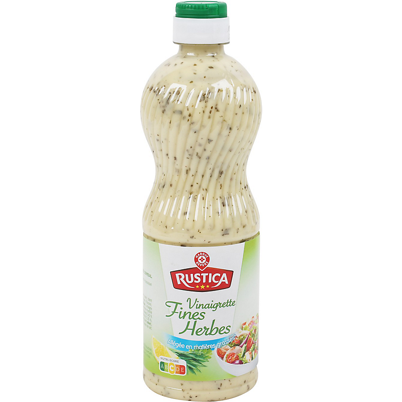 Vinaigrette aux fines herbes, aromatisée cerfeuil, allégée en matières grasses*. 3 fois moins de matières grasses qu'une vinaigrette classique à 75 % d'huile : 2850 kJ (680 kcal) pour 100 g. RUSTICA