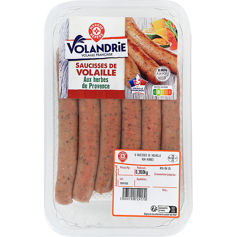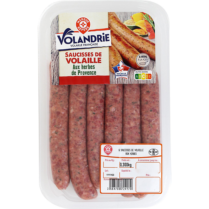 6 saucisses de volaille aux herbes, aromatisées, crues VOLANDRIE