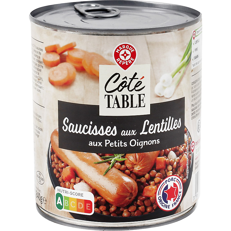 Ingrédients: Eau ; lentilles précuites 27 % ; saucisses pur porc fumées 20 % (viande de porc ; pièce de tête de porc ; eau ; gras et couenne de porc ; plasma de porc ; sel ; épices ; arôme naturel de poivre ; stabilisant : E451 ; gélifiants : carraghénanes, gomme guar, gomme xanthane ; sucre ; arôme naturel d'ail ; arôme naturel de muscade) ; carottes 2,5 % ; double concentré de tomates ; oignons grelots 0,5 % ; oignons en poudre 0,3 % ; amidon modifié de maïs ; sel ; extrait de levure ; arôme naturel de laurier ; arôme naturel de thym ; affermissant : chlorure de calcium ; arôme naturel de poivre ; sucre ; arôme naturel d'ail.