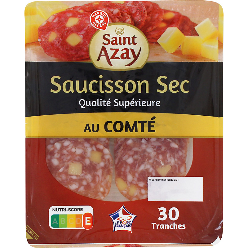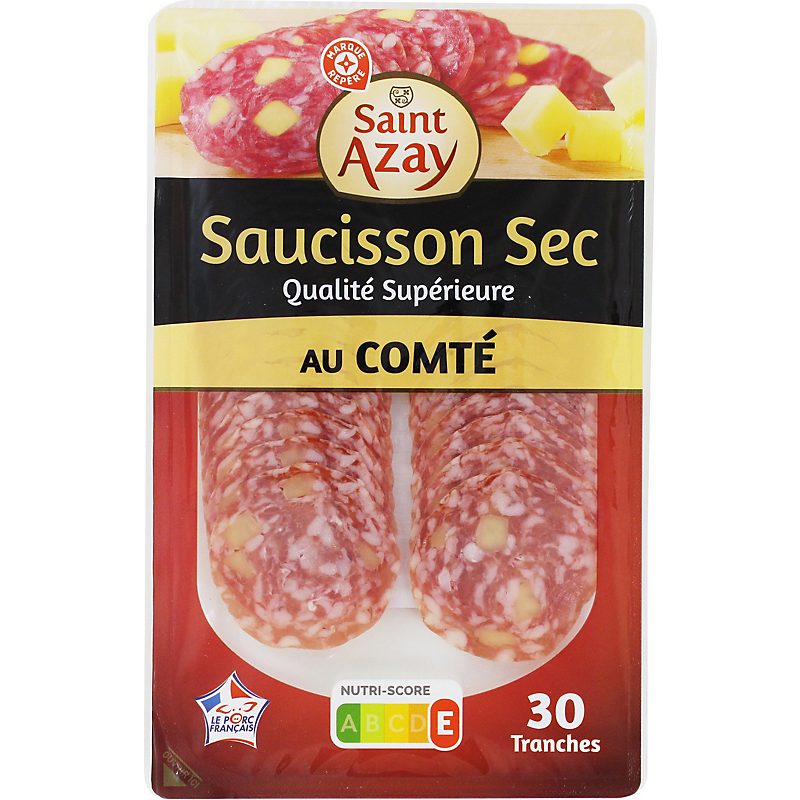 Ingrédients: Viande de porc (origine : France), comté 10 %, sel, lactose, dextrose, épices, ail, antioxydant : E316, conservateur : E252, ferments.