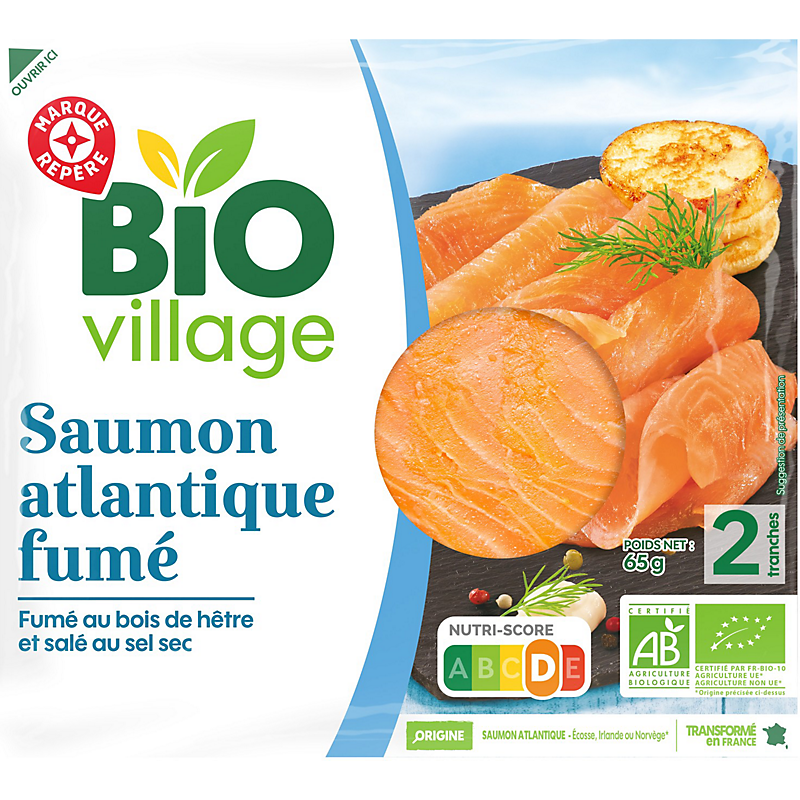 SAUMON ATLANTIQUE (SALMO SALAR) D'ÉLEVAGE* FUMÉ ISSU DE L'AGRICULTURE BIOLOGIQUE * Pays d'élevage : voir sur la face avant de l'emballage. BIO VILLAGE
