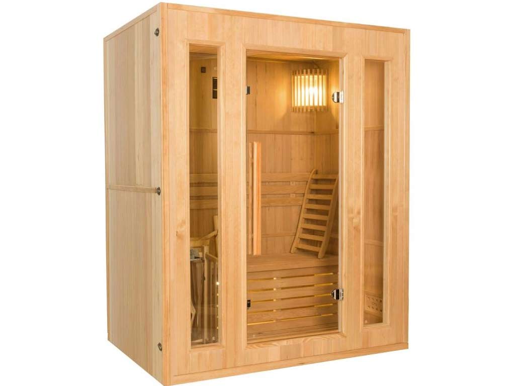 Libellé Sauna Vapeur ZEN - 3 places Pack complet 3.5kW Sauna Technologie vapeur Poêle et pierres inclus Banc double hauteur avec lumière sous banquette