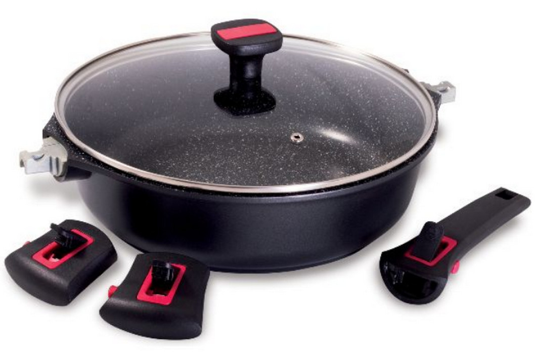 383604 - sauteuse anti-adhésive 28cm + couvercle - Cette sauteuse granit pro BAUMALU 383604 appartient à une gamme d'ustensiles de cuisson pour une cuisine saine : sans ou avec très peu d'ajout de matière grasse! La sauteuse Baumalu est compatible avec tous les feux y compris induction. Maligne, ses poignées sont amovibles, pour un rangement compact et un gain de place optimisé ! La sauteuse peut ainsi se transformer rapidement en petit faitout! En effet, la sauteuse est livrée avec 1 manche et 2 petites poignées en bakélite. Tous 3 sont amovibles et interchangeables facilement par le biais de clips. Ils se verrouillent par une simple pression sur le loquet et se retirent en appuyant sur le bouton rouge sur le côté des éléments. Son couvercle en verre est aussi fourni.La sauteuse Baumalu est en fonte d'aluminium ainsi la répartition de la chaleur se fait de manière homogène pour une cuisson uniforme. Elle est munie d'un revêtement intérieur Whitford QuanTanium : revêtement anti-adhérent sans PFOA de 3 couches renforcées avec du Titane. Ce revêtement est ultra-résistant et durable. La sauteuse est compatible avec le lave-vaisselle (sans poignées et sans manche). - Matière : Fonte d'aluminium.