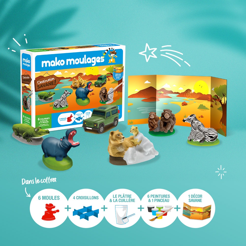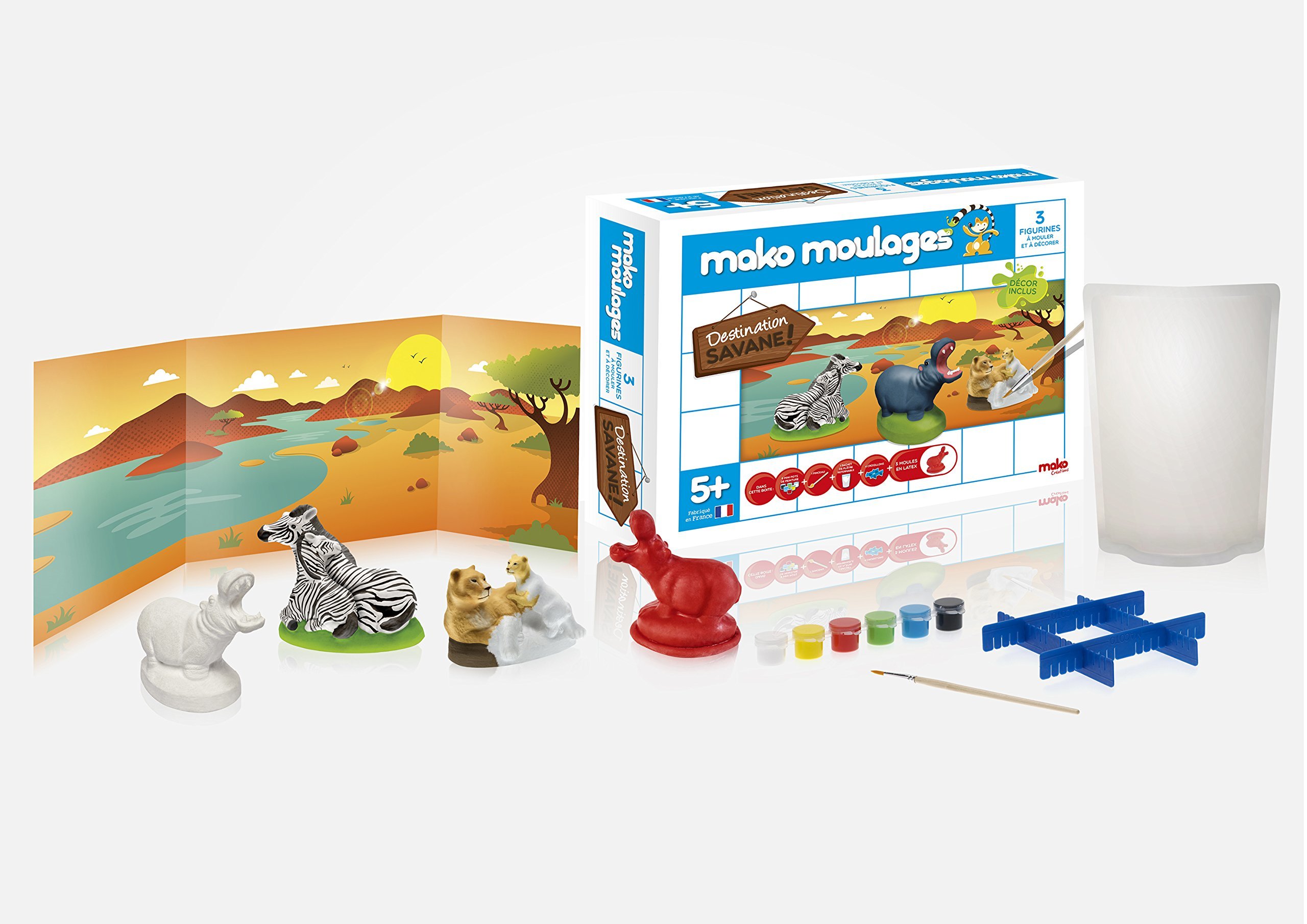 Retrouvez Mako moulages, votre atelier créatif avec 6 moules, la peinture, 1 sachet de plâtre refermable et un décor de jeu.