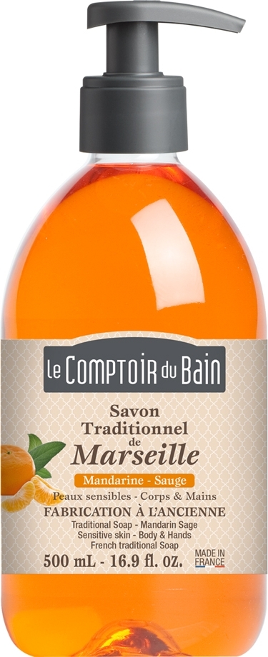 Le Comptoir du Bain Savon Traditionnel de Marseille Mandarine-Sauge 500 ml à la texture plaisante nettoie efficacement et en douceur, laissant un parfum aromatique, fruité et pétillant sur la peau. Idéal pour les peaux sensibles, il convient à un usage quotidien et fréquent. En effet, la base de ce savon est issue de la saponification d'huiles végétales d'origine naturelle.