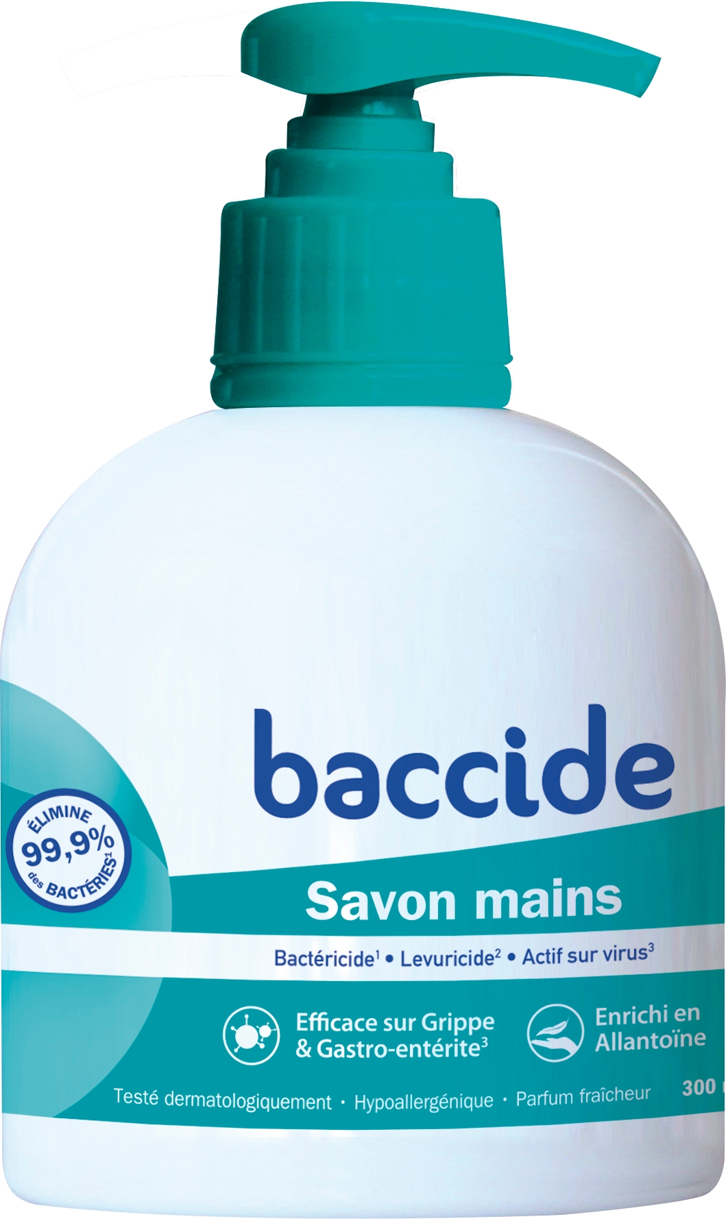 Le savon mains Baccide : la réponse pour une hygiène complète, même à la maison. Comme pour tous les produits de la gamme, Baccide allie l’efficacité contre les microbes à la présence d’un agent apaisant pour la peau. En format pompe, il est très pratique d’utilisation, pour avoir le réflexe mains propres pour tout votre famille ! -Formule triple action : bactéricide1, levuricide2, actif sur virus3 -Efficacité prouvé sur grippe et gastro-entérite3 -Formule agréable : enrichie en allantoïne, parfum fraîcheur, hypoallergénique, testé dermatologiquement Utilisez les biocides avec précaution. Avant toute utilisation, lisez l’étiquette et les informations concernant le produit. (1) NF EN 1276 (2010, 30s), NF EN 13727 + A2 (2015, 30s), NF EN 1499 (2013, 30s). (2) NF EN 1650 + A1 (2013, 1min), NF EN 13624 (2013, 1min). (3) Actif en 35s sur Influenza virus [H1N1] (virus de la grippe A) selon NF EN 14476 + A1 (2015) et en 30s sur Rotavirus (virus de la gastro-entérite) selon NF EN 14476 + A1 (2015). Tests menés à 20°C en conditions de saleté.