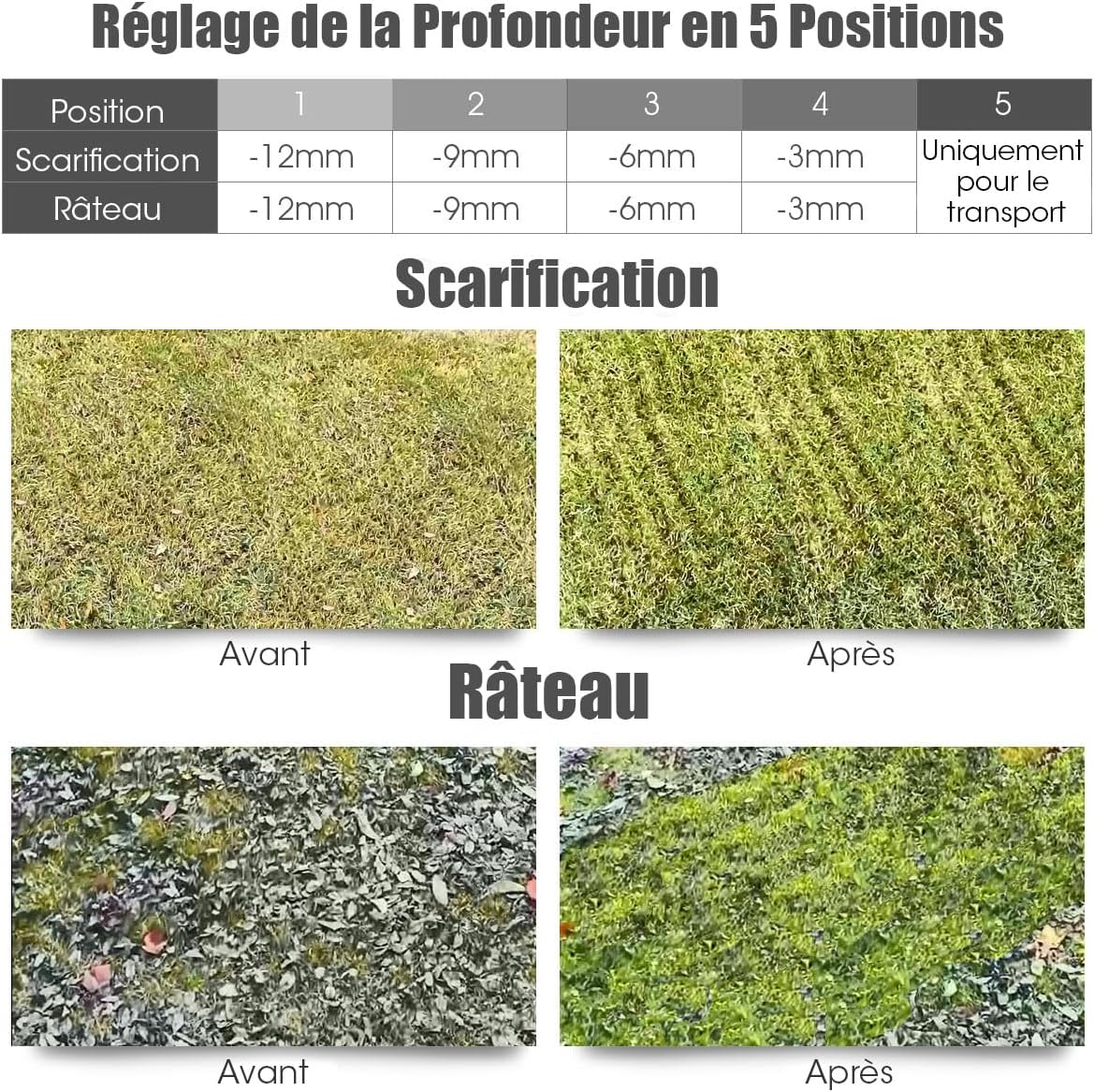 [ Profondeur à 4 positions ] La déchaumeuse à gazon dispose d'un réglage de la hauteur à 4 positions qui convient à différents types d'herbe et d'un niveau 0 pour le transport. De plus, vous pouvez facilement choisir une profondeur appropriée grâce à un levier pour scarifier votre pelouse et perforer le sol.