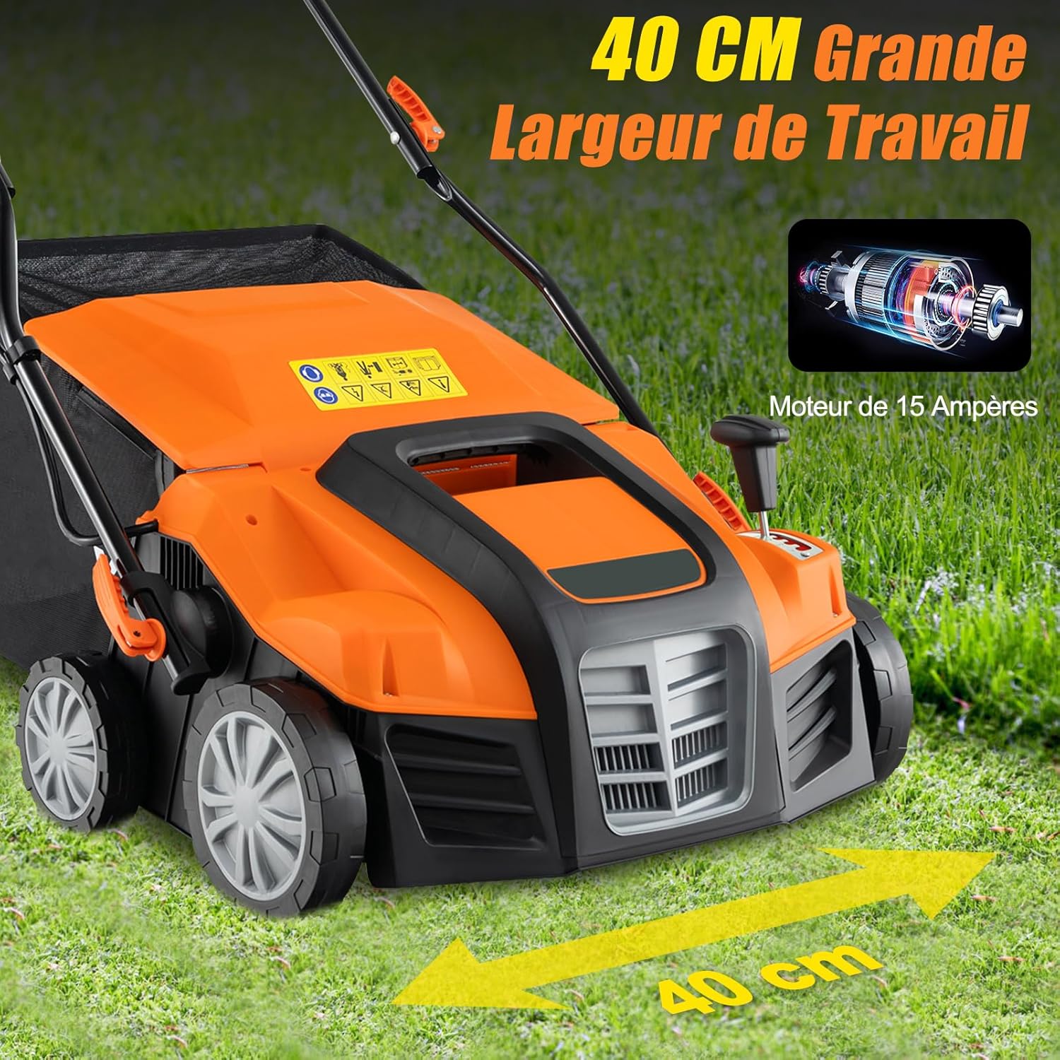 [ Grande largeur & moteur puissant ] Grâce à un puissant moteur de 15 A, accélérant jusqu'à 3 500 tr/min, ainsi qu'une largeur de travail de 40 cm, ce déchaumeur et scarificateur électrique revitalise efficacement votre pelouse, économisant du temps et de l'énergie tout en fournissant des résultats de qualité professionnelle.
