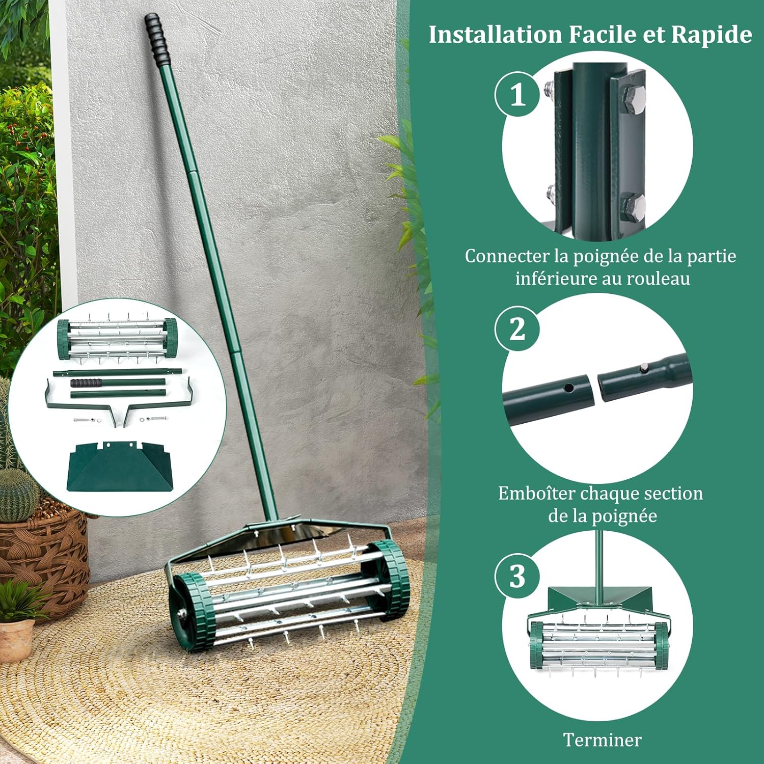 [ Simple à assembler ] Pour assembler la poignée, il vous suffit de tourner les 3 tubes pour les serrer. Après cela, vous pouvez connecter la poignée au rouleau en serrant les attaches. L'ensemble du processus ne prend que quelques minutes. Ensuite, un aérateur de pelouse est prêt à l'emploi.