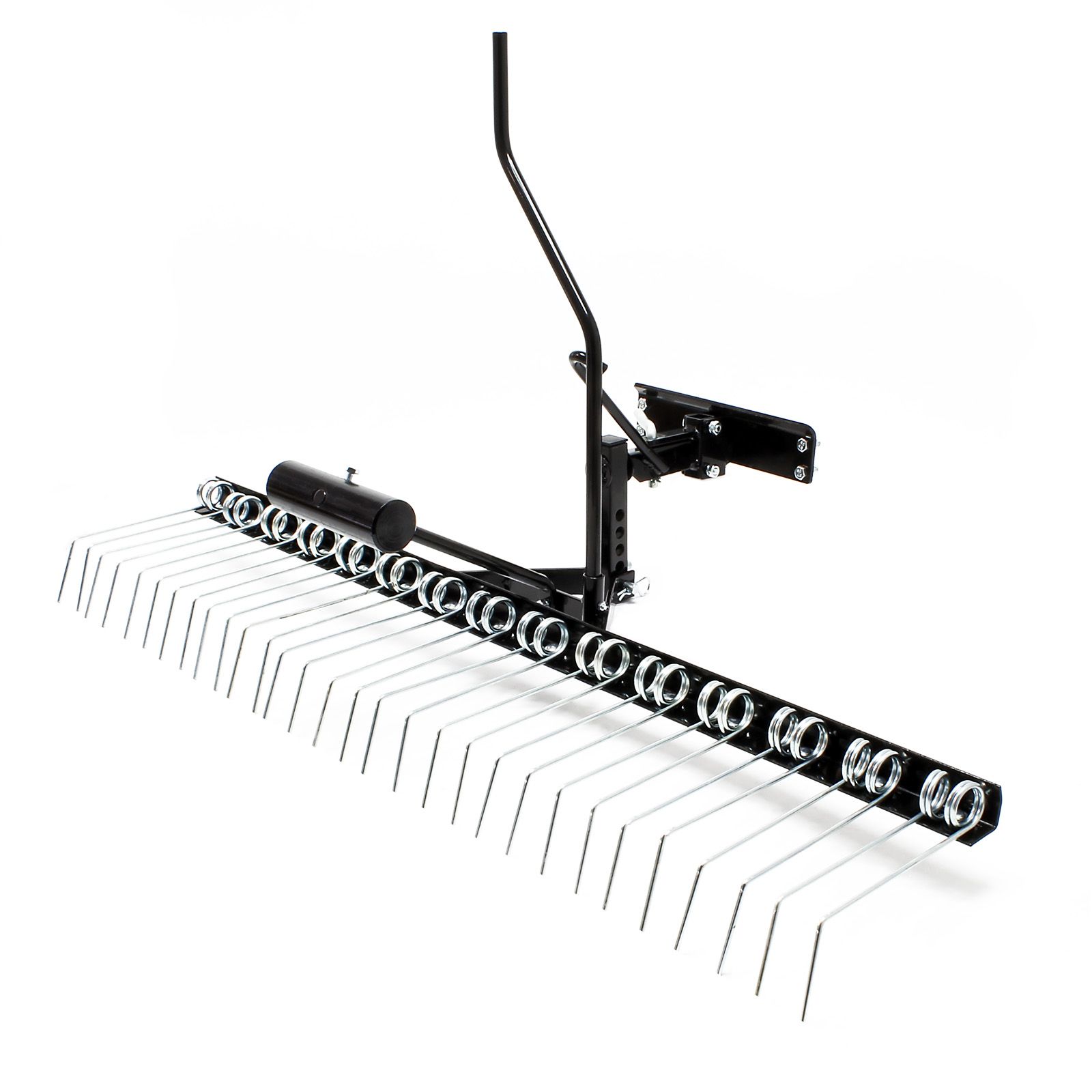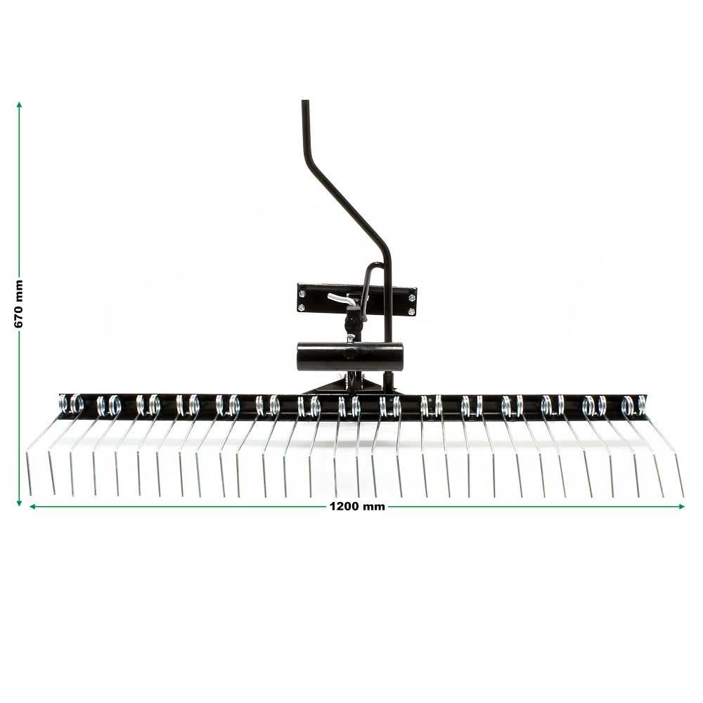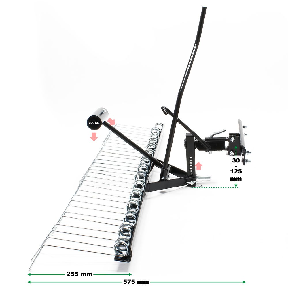 Grâce au scarificateur de pelouse pour tondeuse autoportée, vous pouvez débarrasser votre pelouse simplement et facilement de la mousse et de d‘autres résidus et l’aérer par la même occasion. Votre gazon pourra ainsi se développer sainement. Vous retrouverez par la suite une pelouse dense et bien verte. Le dispositif d'attelage vous permettra d’atteler simplement et en toute sécurité, le scarificateur à la tondeuse autoportée, si cette dernière est munie bien évidemment de ce dispositif. Par une croissance de mouse très dense, nous vous recommandons de rajouter du poids supplémentaire au scarificateur (poids NON inclus à la livraison), par conséquent, les ressorts en acier galvanisés vont exercer une pression plus forte sur la pelouse afin d’atteindre un effet de démoussage plus intense Propriétés Dimensions: ressorts en acier : Ø 5 mm