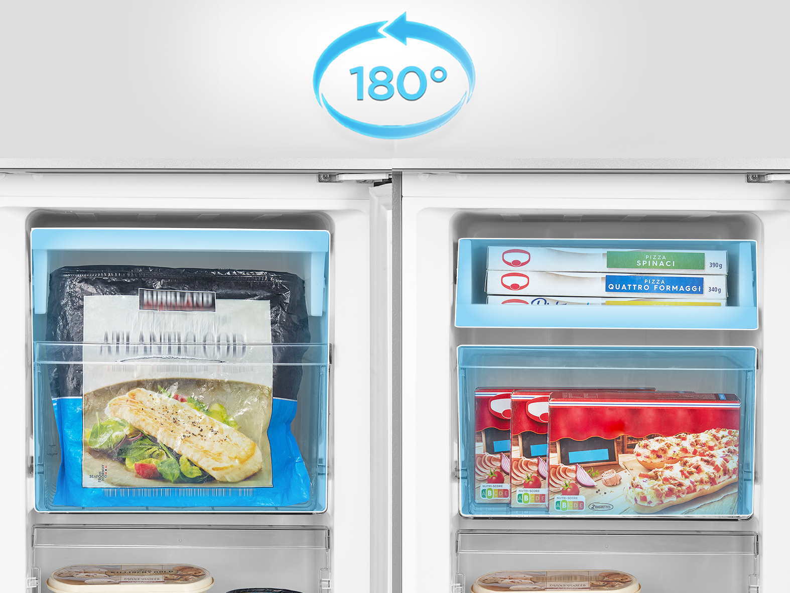 Le compartiment réfrigérateur dispose de 3 clayettes en verre résistantes, d’un bac à légumes spacieux et de 3 balconnets de porte pour ranger facilement bouteilles, produits laitiers et condiments. Son éclairage LED intégré offre une visibilité parfaite à chaque ouverture, tout en consommant très peu d’énergie. Le thermostat mécanique réglable vous permet d’ajuster la température simplement selon vos besoins et la saison.