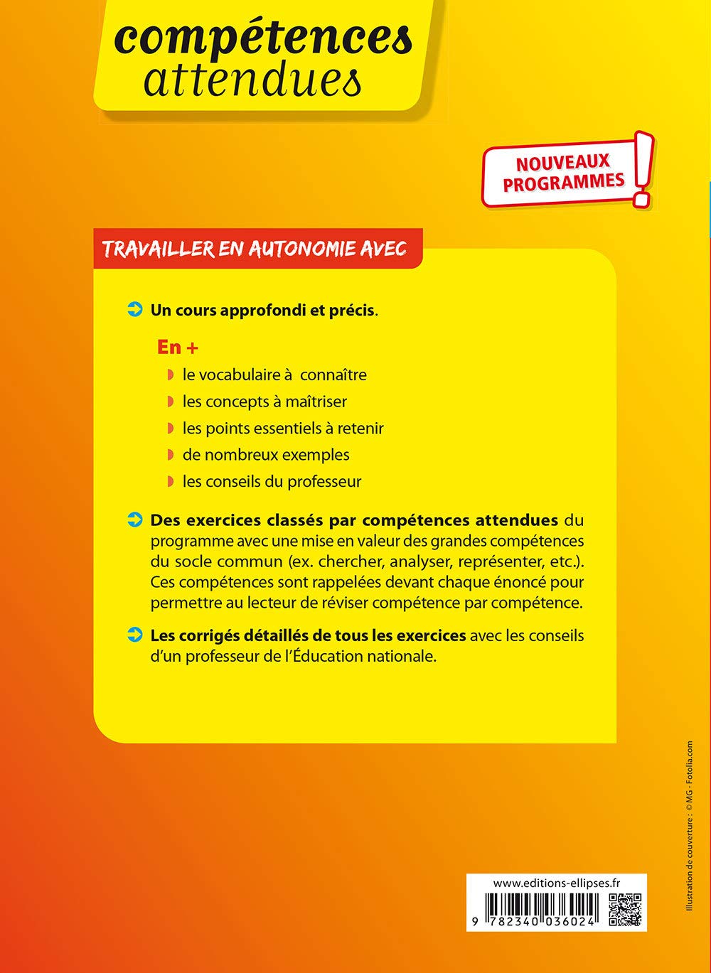 Des exercices classés par compétences attendues du programme avec une mise en valeur des grandes compétences du socle commun (ex. chercher, analyser, représenter, etc.). Ces compétences sont rappelées devant chaque énoncé pour permettre au lecteur de réviser compétence par compétence.