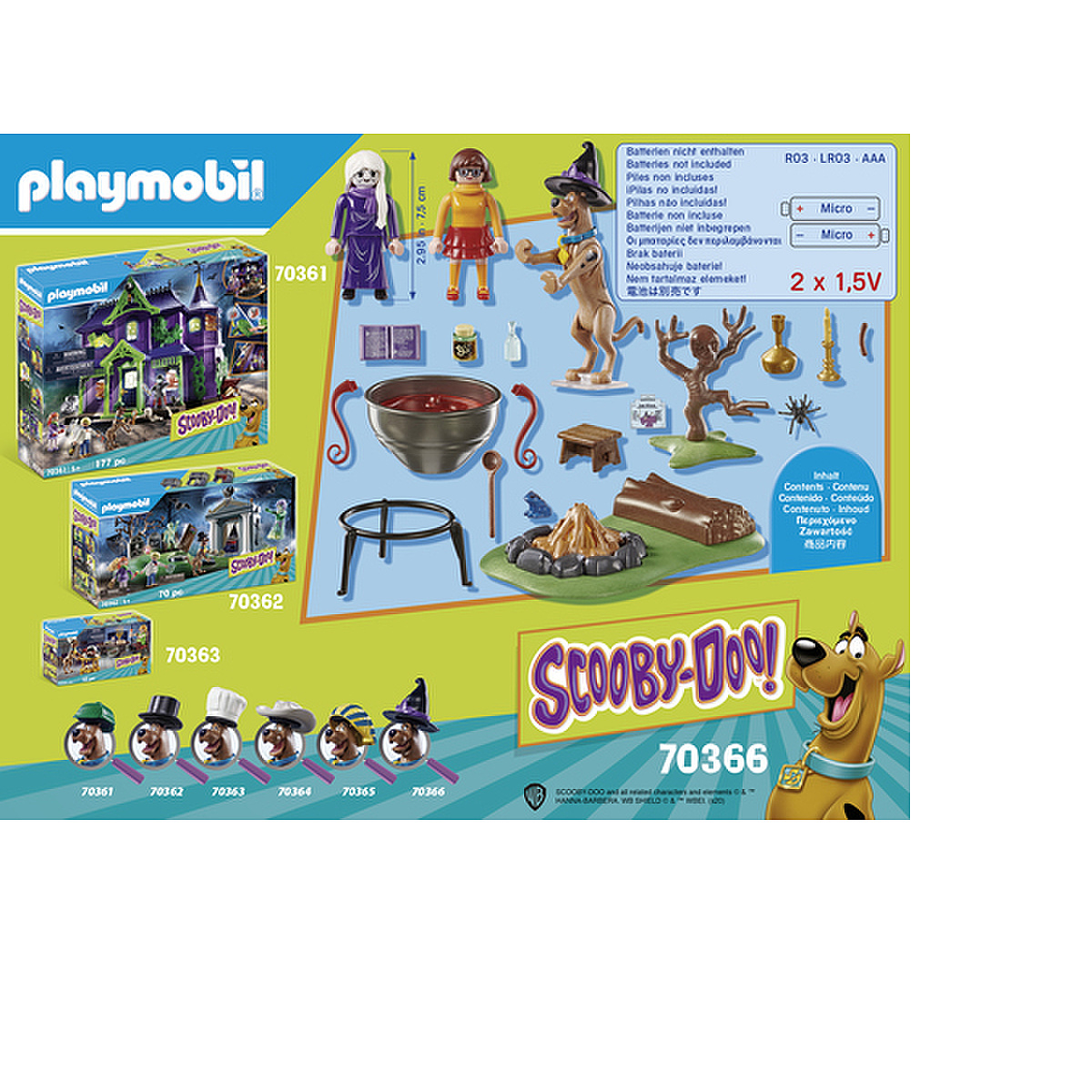| Plus produit | - Comprend les personnages de la série animée : Vera et Scooby-Doo. \n- Scooby-Doo peut saisir des objets et les garder dans sa bouche. Le collier de chien est amovible. Le socle transparent permet à Scooby-Doo de se tenir sur ses pattes postérieures. Le collier de chien est amovible. \n- La sorcière peut être démasquée. Son visage redevient normal une fois les cheveux retirés et la tête tournée. \n- Contient une carte fantôme représentant la sorcière Zeb. La carte fantôme peut être insérée dans le cercueil de la Ref.70361 Histoire dans le Manoir et dans le moniteur de la Mystery Machine (Ref.70286). - Scooby-Doo porte un chapeau de sorcier à collectionner. |
