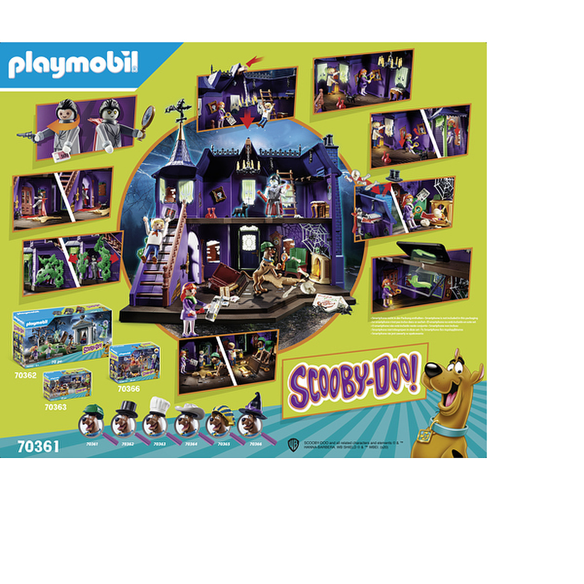 | Plus produit | - Comprend les personnages de la série animée : Scooby-Doo, Fred et Daphné. Scooby-Doo peut saisir des objets et les garder dans sa bouche. Le socle transparent permet à Scooby-Doo de se tenir sur ses pattes postérieures. Le collier de chien est amovible.\n- Le vampire peut être démasqué. Son visage redevient normal une fois les cheveux retirés et la tête tournée. \n- Le couvercle de la poubelle à l\'extérieur s\'ouvre. La poubelle peut servir de cachette.- Les volets et les lattes de bois devant les fenêtres sont interchangeables. - Les rideaux s\'illuminent dans le noir.\n- La bibliothèque est une porte tournante menant à une pièce secrète sous l\'escalier. Il est possible d\'accéder à la pièce secrète depuis l\'extérieur : son ouverture est couverte par des plantes qui peuvent être déplacées.\n- Les plantes à l\'extérieur du bâtiment peuvent être décorées avec par exemple des araignées.- Au rez de chaussée, un trappe renferme une cachette et peut être soulevée en appuyant avec les doigts sur le côté. Les traces de pas donnent un indice sur l\'emplacement de la cachette...\n- En poussant le bougeoir vers la droite, l\'escalier se transforme en toboggan.- Le lustre de l\'étage tombe lorsque l\'on actionne le levier.\n- Une trappe peut être ouverte à l\'étage en inclinant le portrait qui se trouve au dessus, elle permet de faire tomber les personnages qui se trouvent sur la trappe.\n- Le couvercle de la cheminée se retire et des objets peuvent être cachés à l\'intérieur. \n- Le cercueil fourni produit des effets lumineux et sonores (Nécessite 3 piles LR03 AAA non fournies). En appuyant sur le bouton situé au centre du cercueil, la lumière s\'allume. Une zone extractible située sur le côté gauche du cercueil permet d\'insérer une carte fantôme et de projeter l\'image de la carte fantôme sur le mur du manoir. En appuyant sur l\'un des 8 boutons accompagnés d\'un pictogramme, il est possible de déclencher jusqu\'à 8 sons différents.\n- Les araignées et les chauves-souris peuvent être utilisées pour décorer le manoir.\n- Contient trois cartes fantômes et tenue de détective pour Scooby-Doo. \n- Contient trois cartes fantômes correspondant au vampire, à la bibliothèque et à la cachette du rez-de chaussée. Les cartes fantôme peuvent être insérées le cercueil et dans le moniteur de la Mystery Machine (Ref.70286). \n- Scooby-Doo porte un chapeau de détective à collectionner. |