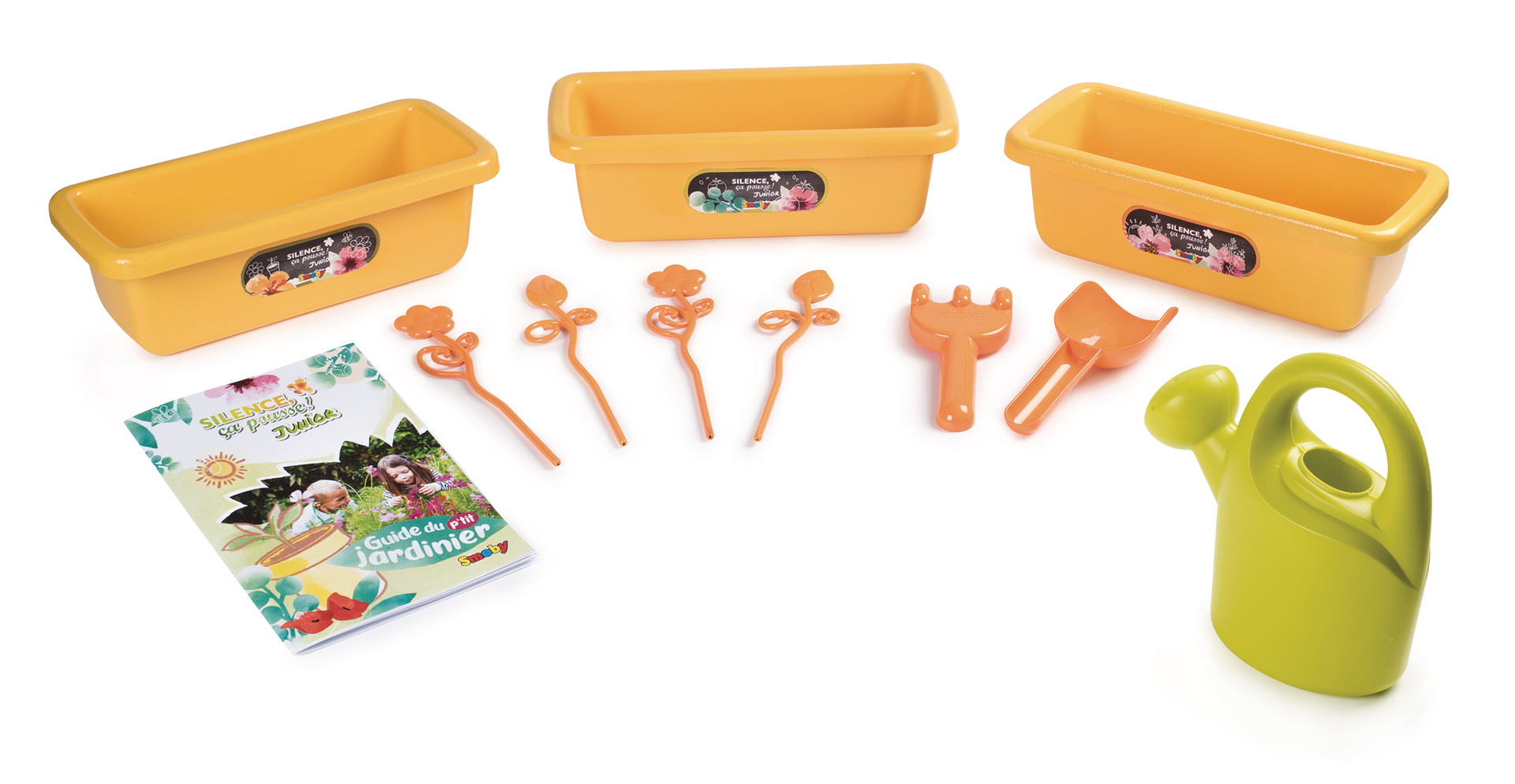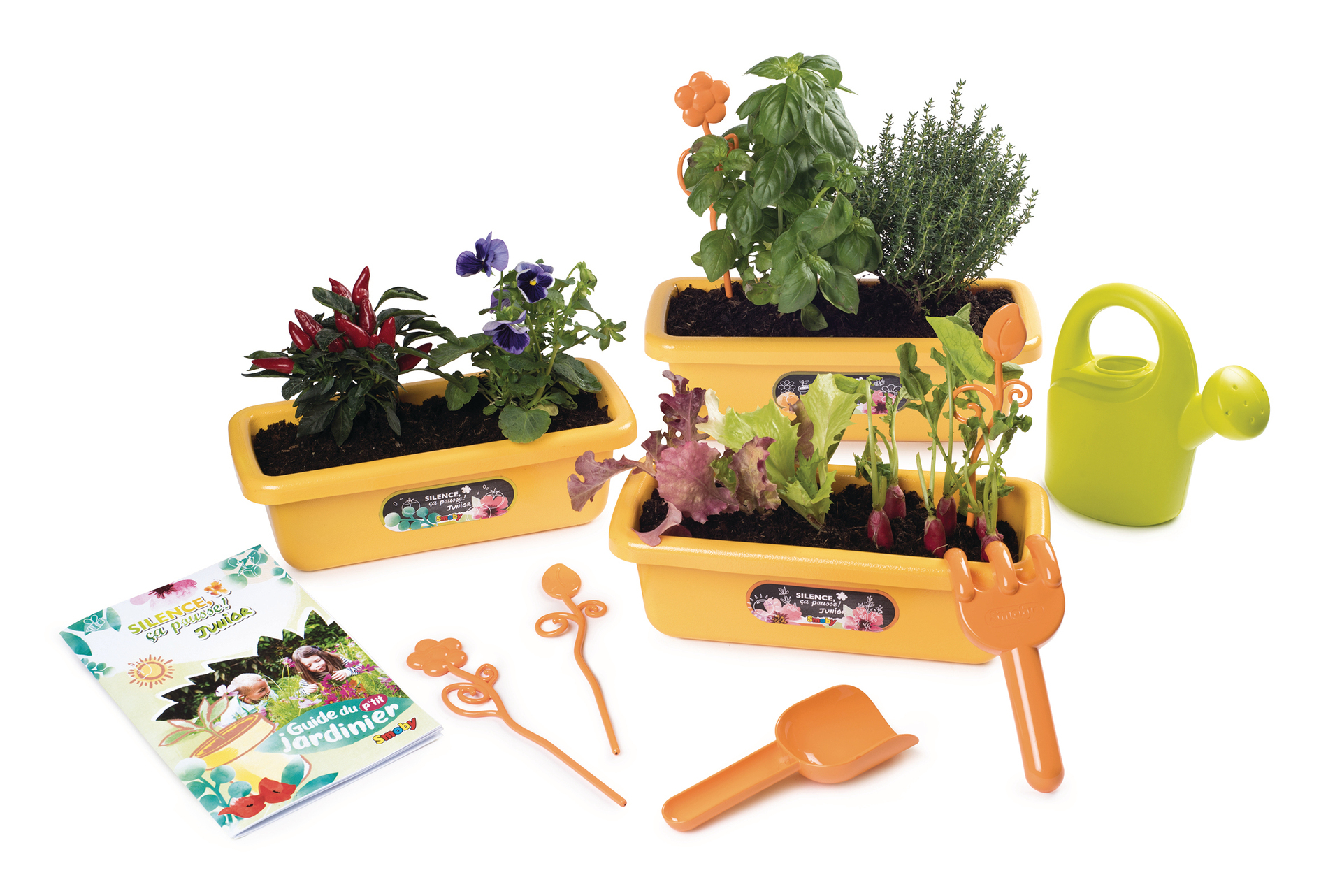 Set composé de 3 jardinières avec 1 arrosoir, 1 doublette (pelle et râteau), 4 tuteurs, et 1 livret explicatif.