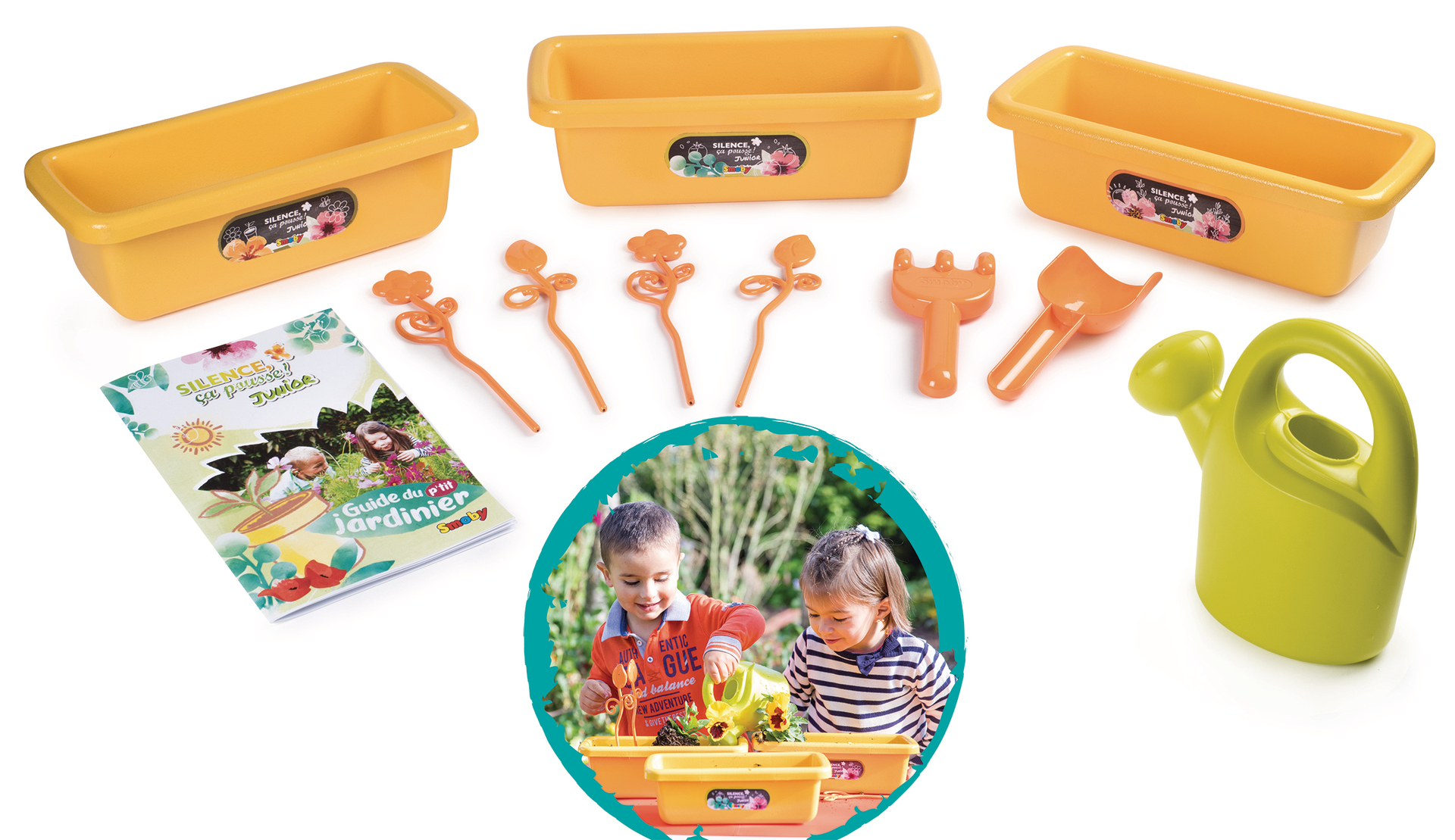 | Plus produit | Set composé de 3 jardinières avec 1 arrosoir, 1 doublette (pelle et râteau), 4 tuteurs et 1 livret explicatif. |