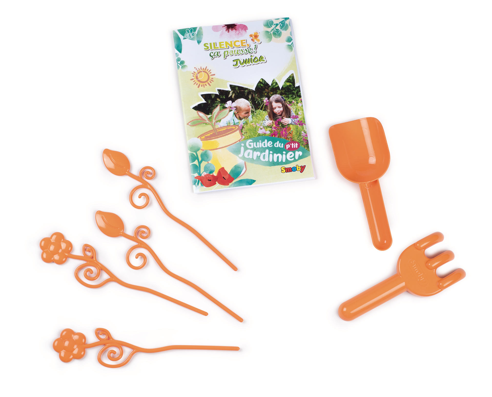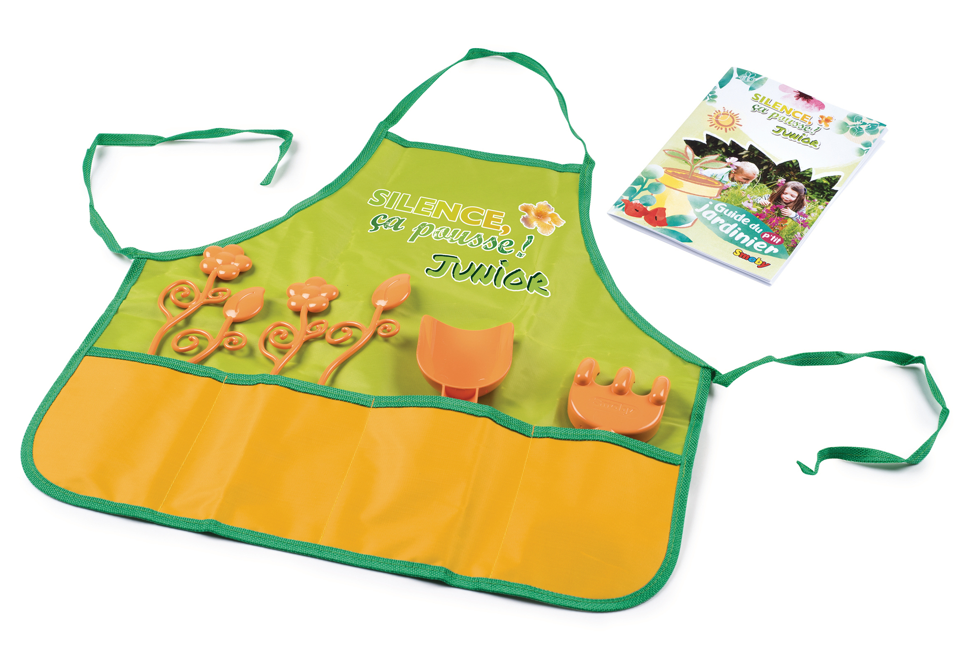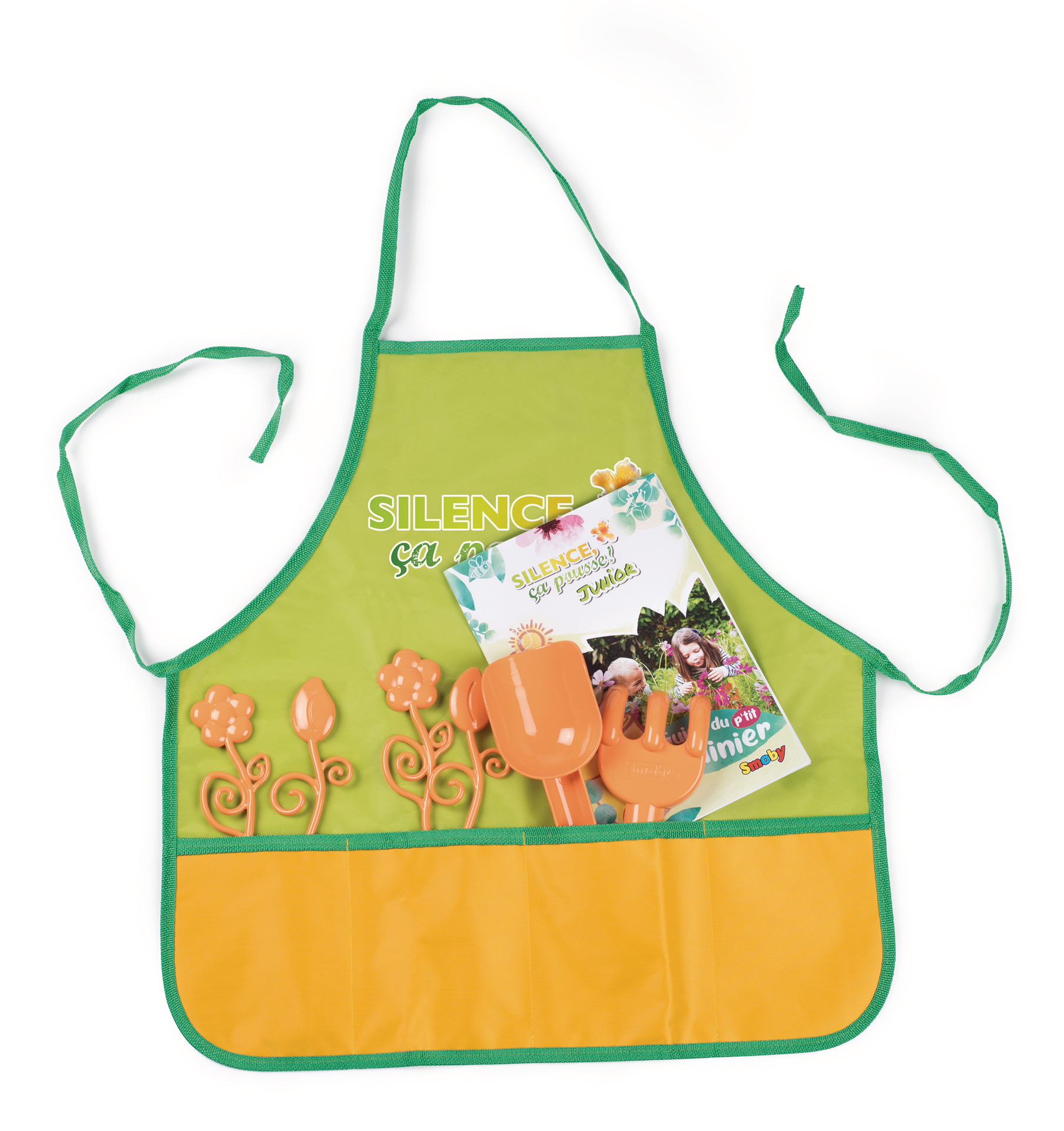 Ce set est composé d'un tablier aux couleurs de "Silence ça pousse !" avec poches intégrées pour plus de praticité, d'une doublette (râteau et pelle), de 4 tuteurs, et d'un livret explicatif.