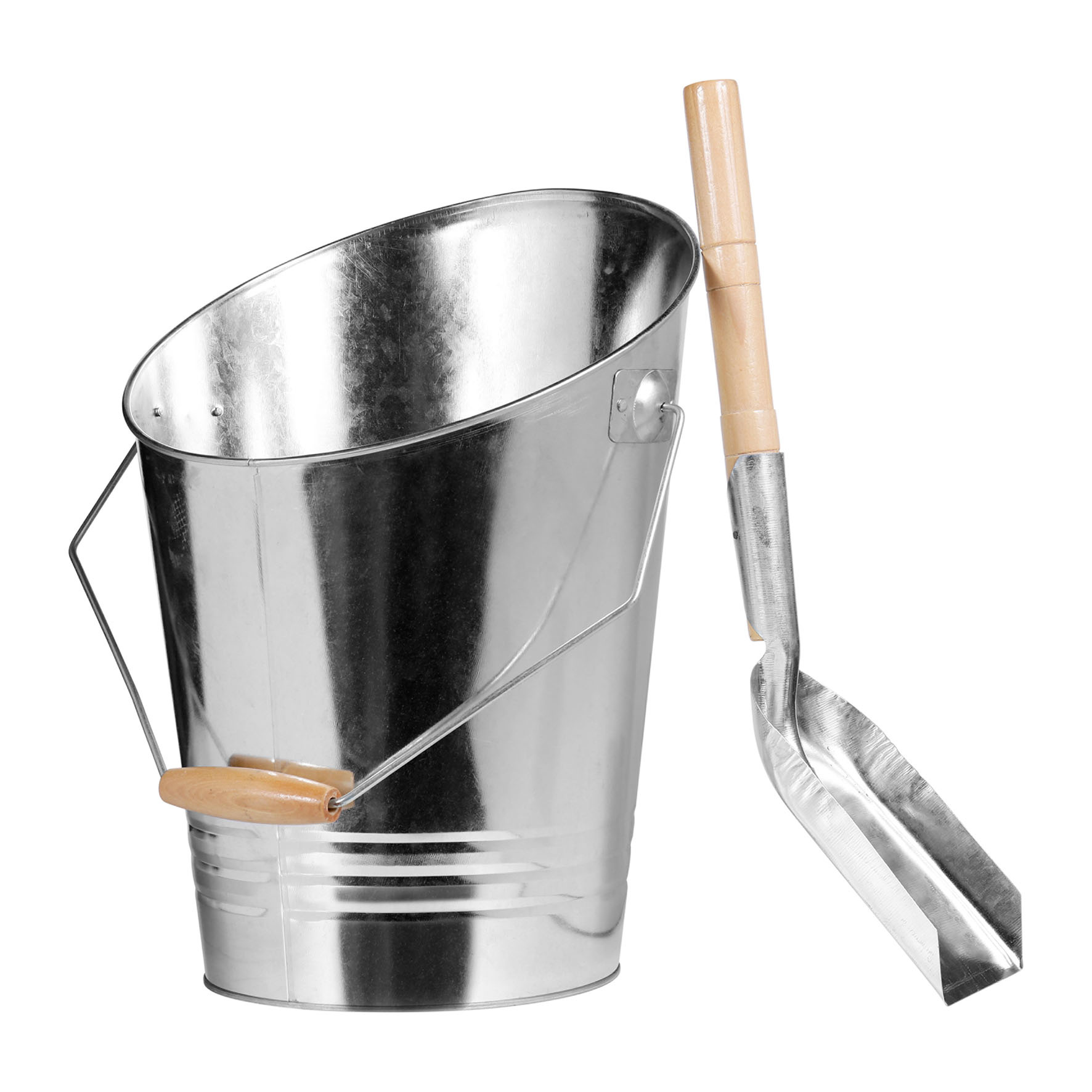 Seau à ouverture oblique. dimensions du seau : Ø 20,5 (en bas) x Ø 26,5 (à hauteur de l'anse) x H 40 cm. Dimensions de la pelle : 11 x H 45 cm.