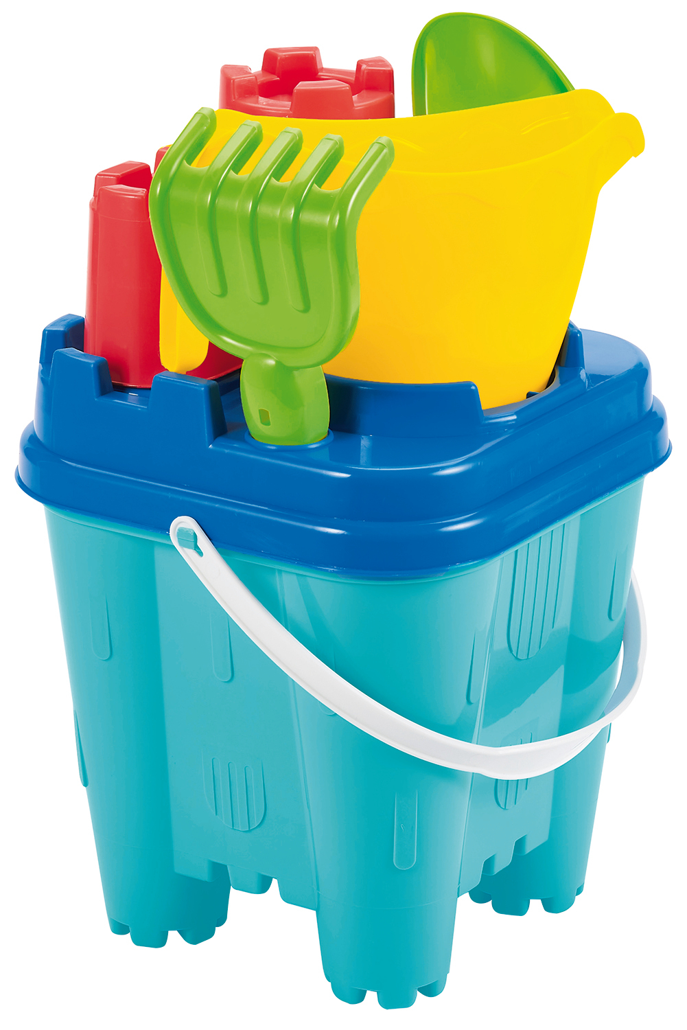 Un seau de 18,5 cm en forme de château fort garni d'un tamis, un moule, un arrosoir, d'une pelle et d'un râteau. Conseillé dès 18 mois. Origine France Garantie.