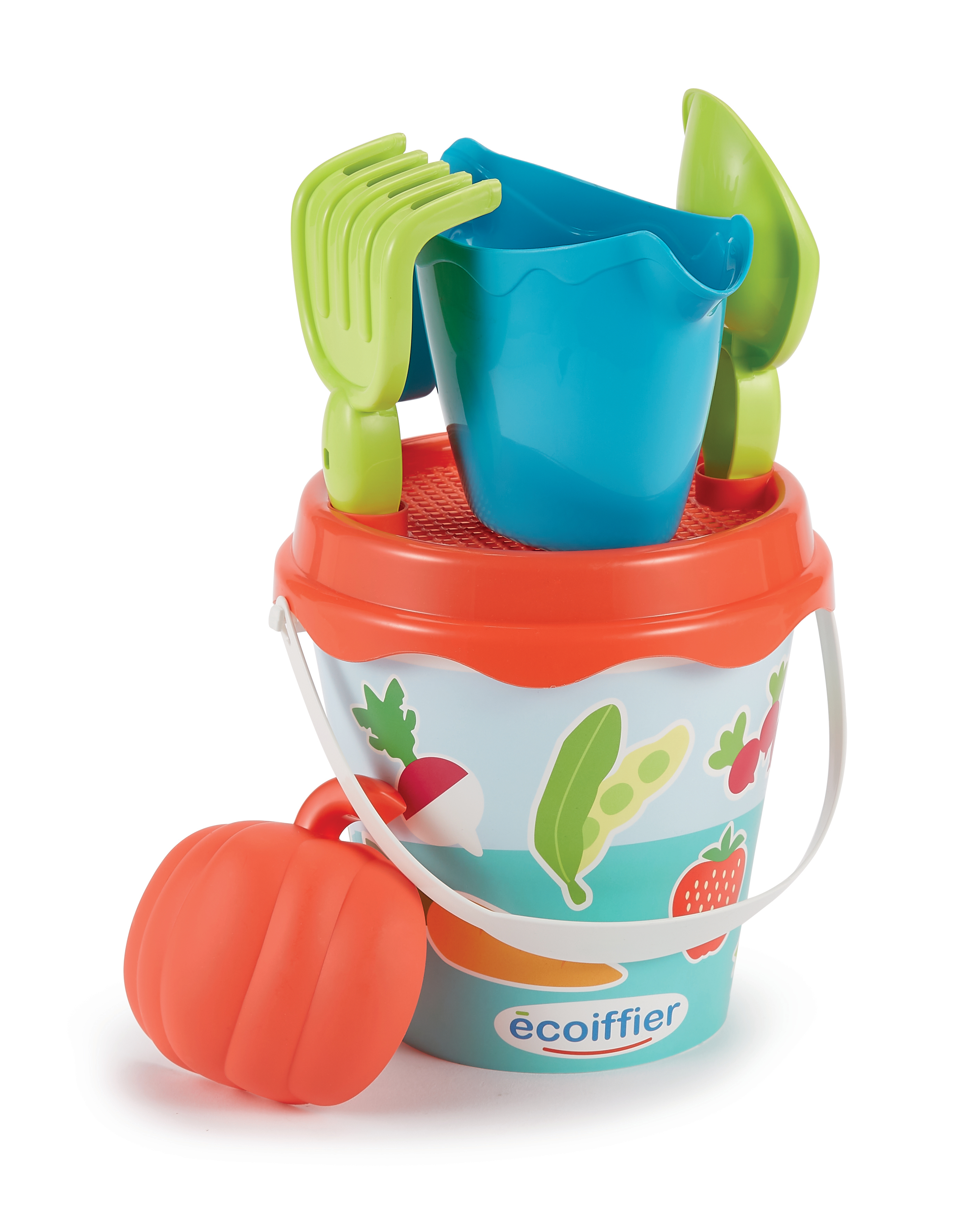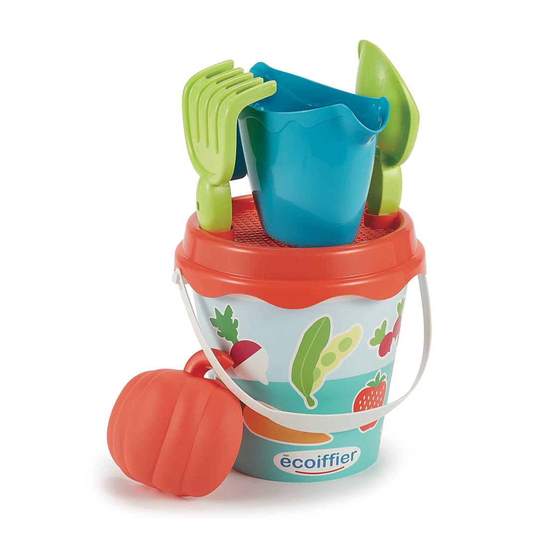 Un seau de 17 cm décoré sur le thème des fruits et légumes garni d'un arrosoir, d'une pelle, d'un rateau, d'un tamis et d'un moule à sable en forme de légumes. Origine France Garantie. Dès 18 mois.