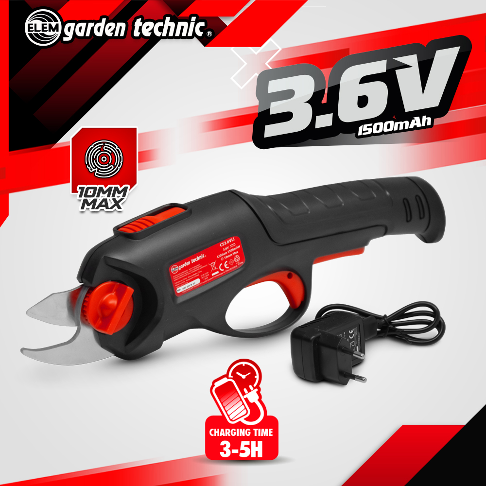 | Libellé | Sécateur rechargeable 3.6V lithium livré avec batterie intégrée et chargeur - Elem Garden |