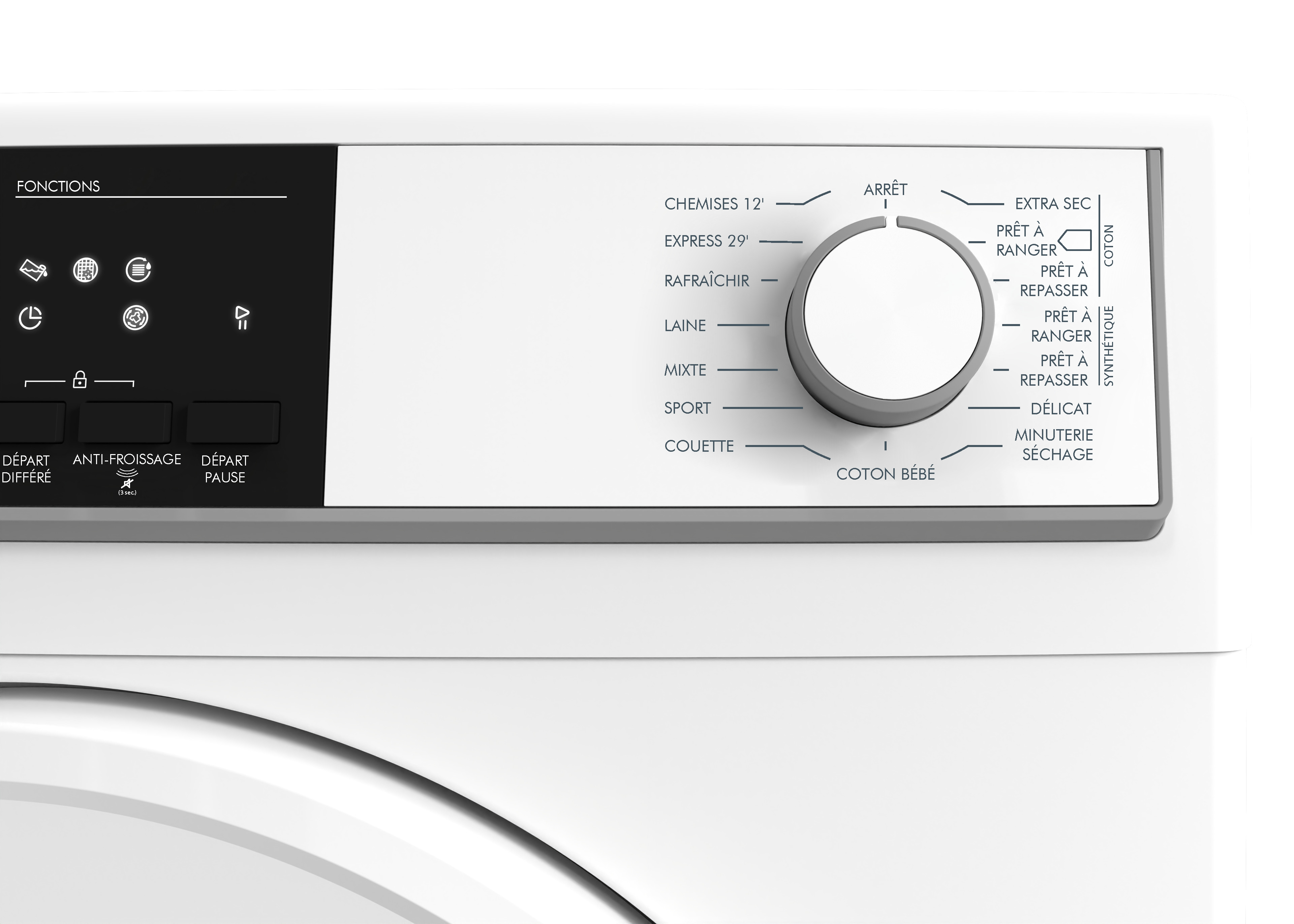 Sèche linge 9 kg condenseur Nombre de programmes : 15 programmes Classe énergétique : Classe B Départ différé Tambour Bubbledrum Eclairage intérieur, rotation alternée, sonde d'humidité Bac anti débordement, WaveCabinet Affichage LED Dimensions : H84.5 x L59.6 x P60.9 cm