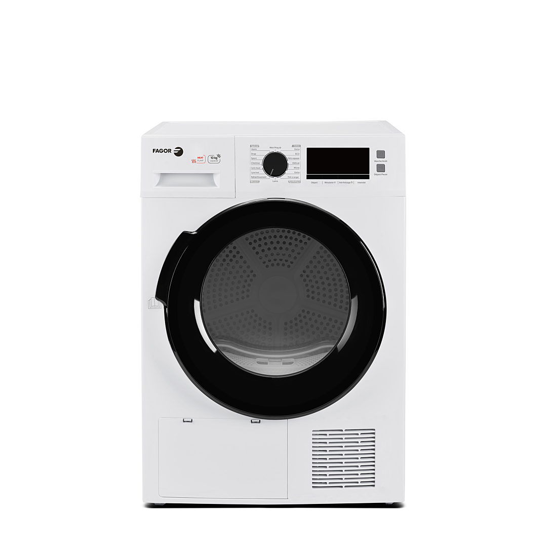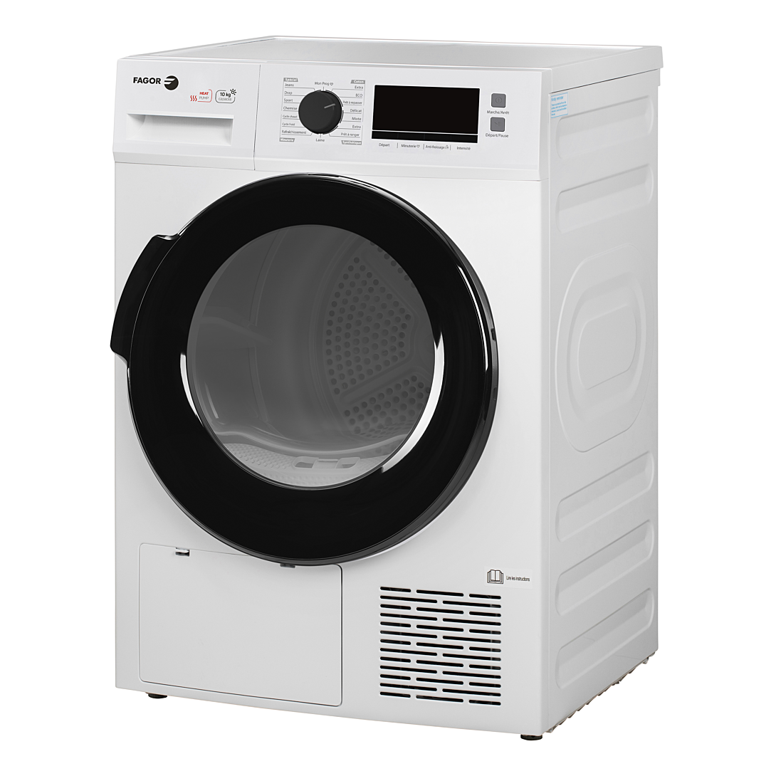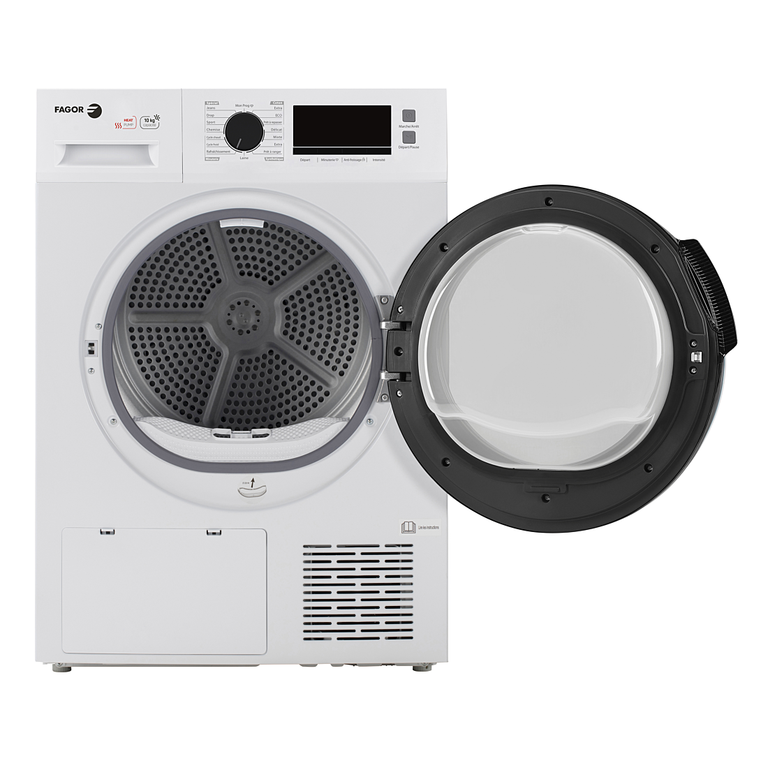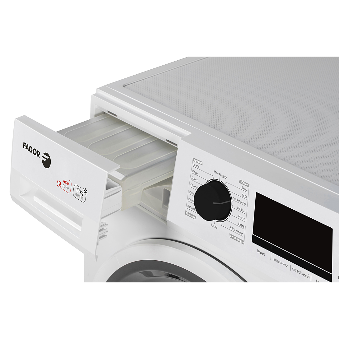 Sèche-linge pompe à chaleur, 10 kg , Blanc, 16 programmes dont 1 personnalisable, départ différé 1-24H, 125L, classe D, 65dB Programmes :1 programme personnalisable "Mon prog", jeans, Drap, Sport, Chemise, Cycle chaud, Cycle froid, Rafraîchissement, Laine, Prêt à ranger, Extra, Mixte, Délicat, Prêt à repasser, ECO, Extra
