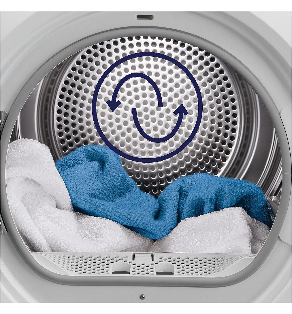 Le tambour tourne dans les deux sens durant le séchage afin de séparer les vêtements et d'empêcher qu'ils ne s'enchevêtrent. Ainsi, les charges sont séchées de façon uniforme, pour un résultat moins froissé.