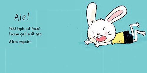 Aïe ! Petit Lapin est tombé. Sur le bras en plus, ça fait mal ! Souffle trois fois dessus, ça aidera certainement. Oh là là, du sang ! Vite, voilà un pansement ! Et sèche ses larmes maintenant. Bravo tu t'es super bien débrouillé !