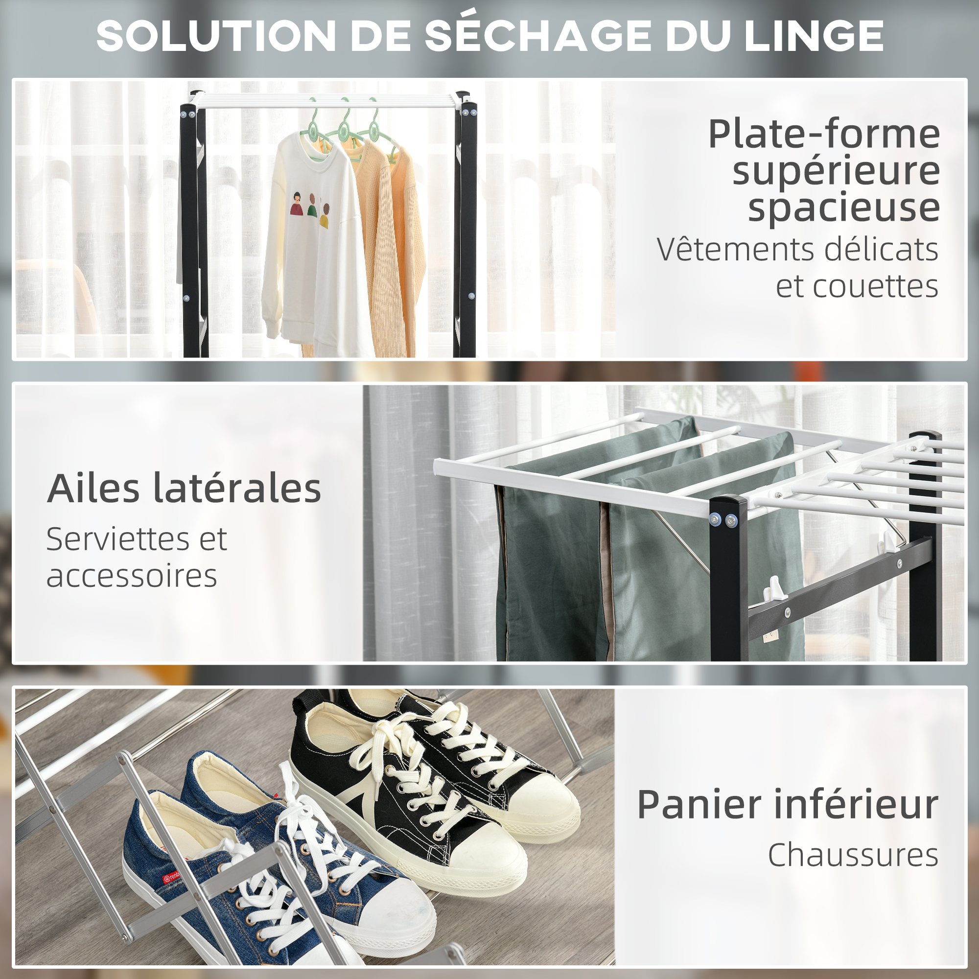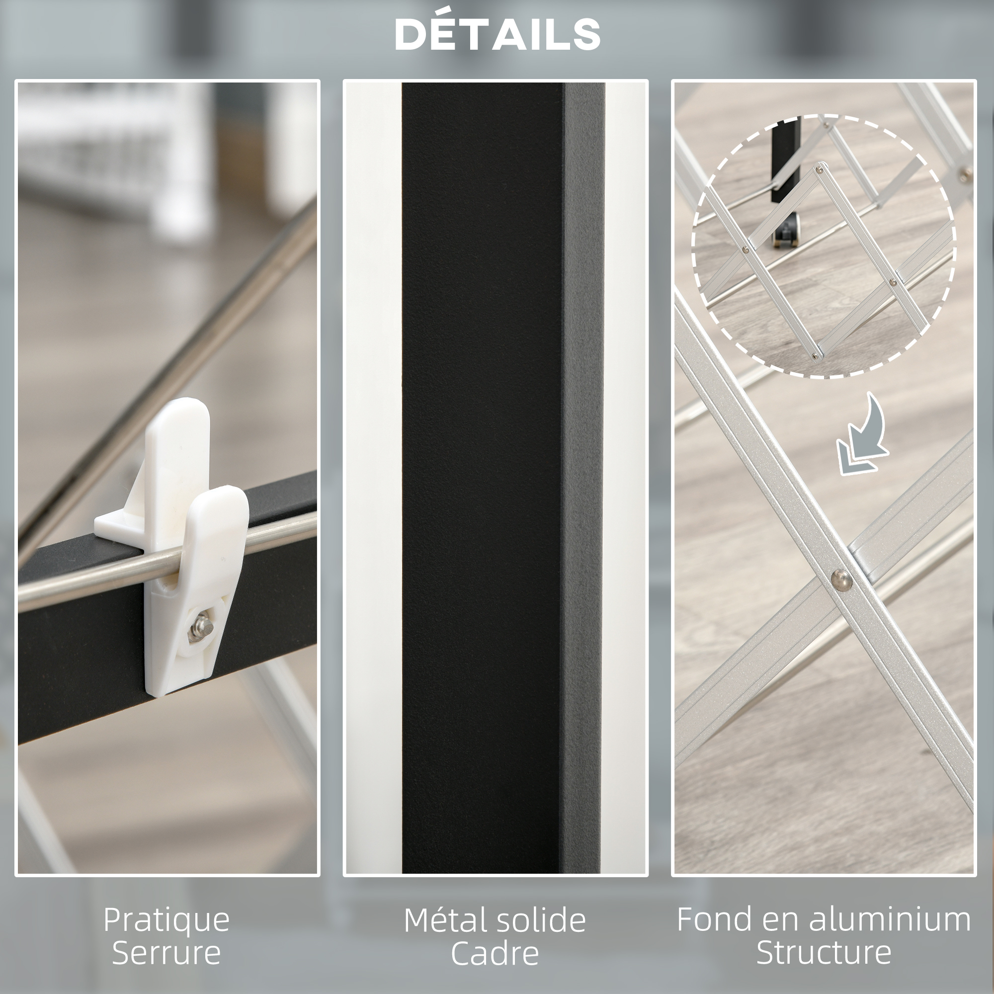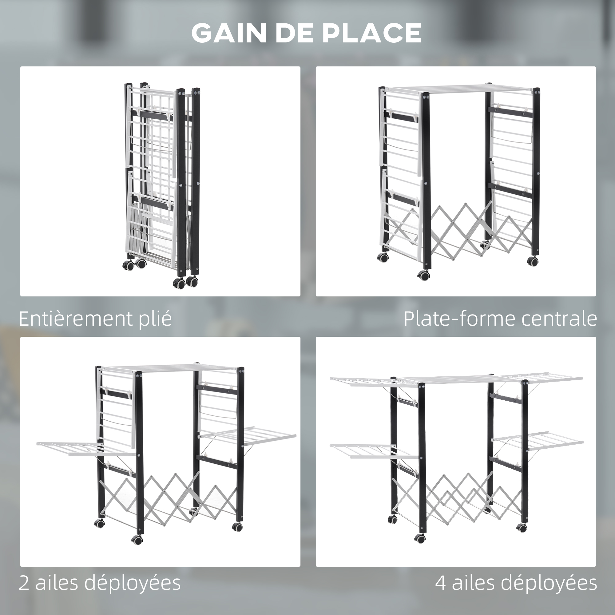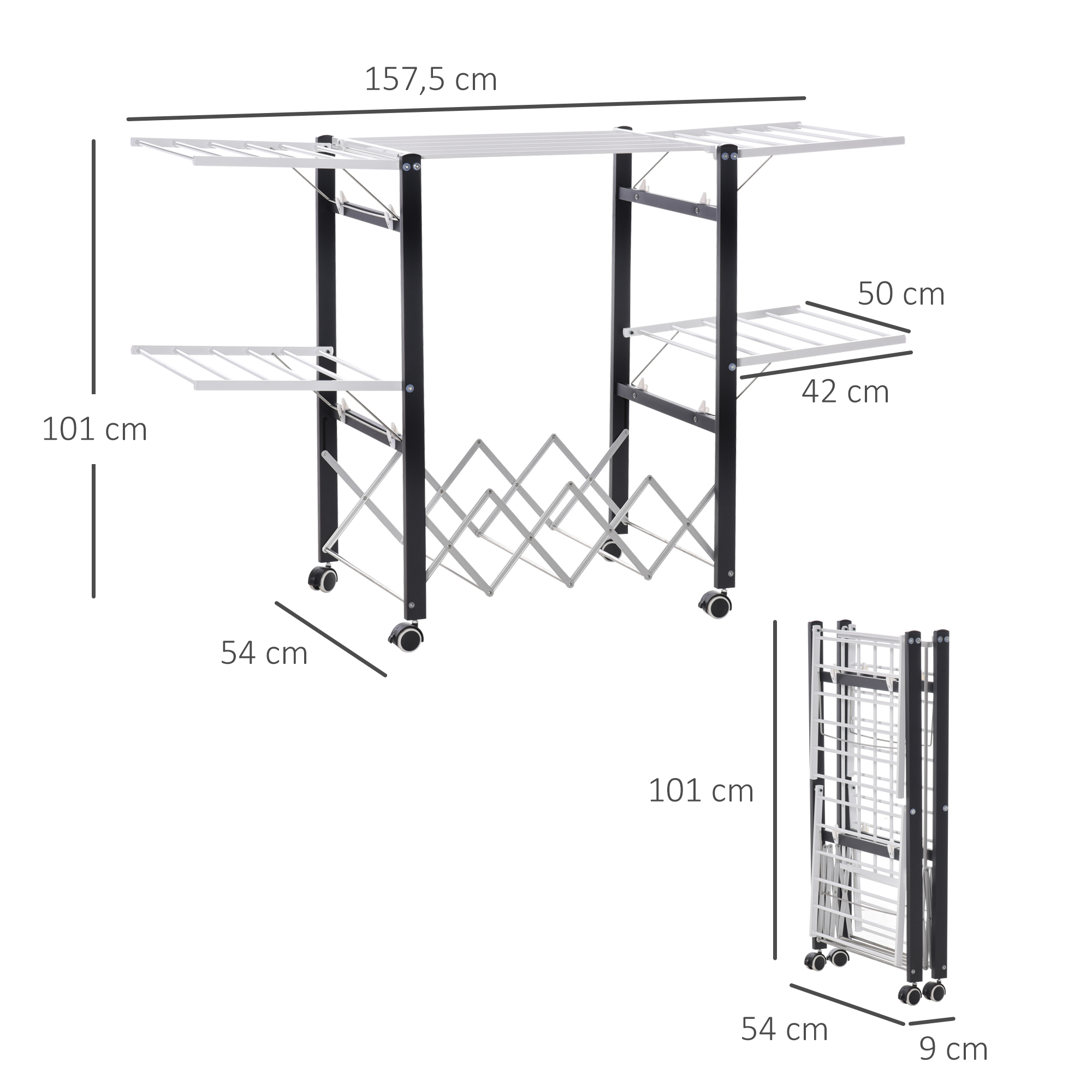 | Libellé | Séchoir à linge étendoir à vêtements pliable réglable avec 4 roulettes - grand capacité - dim. 157,5L x 54l x 101H cm - alu. métal blanc noir |