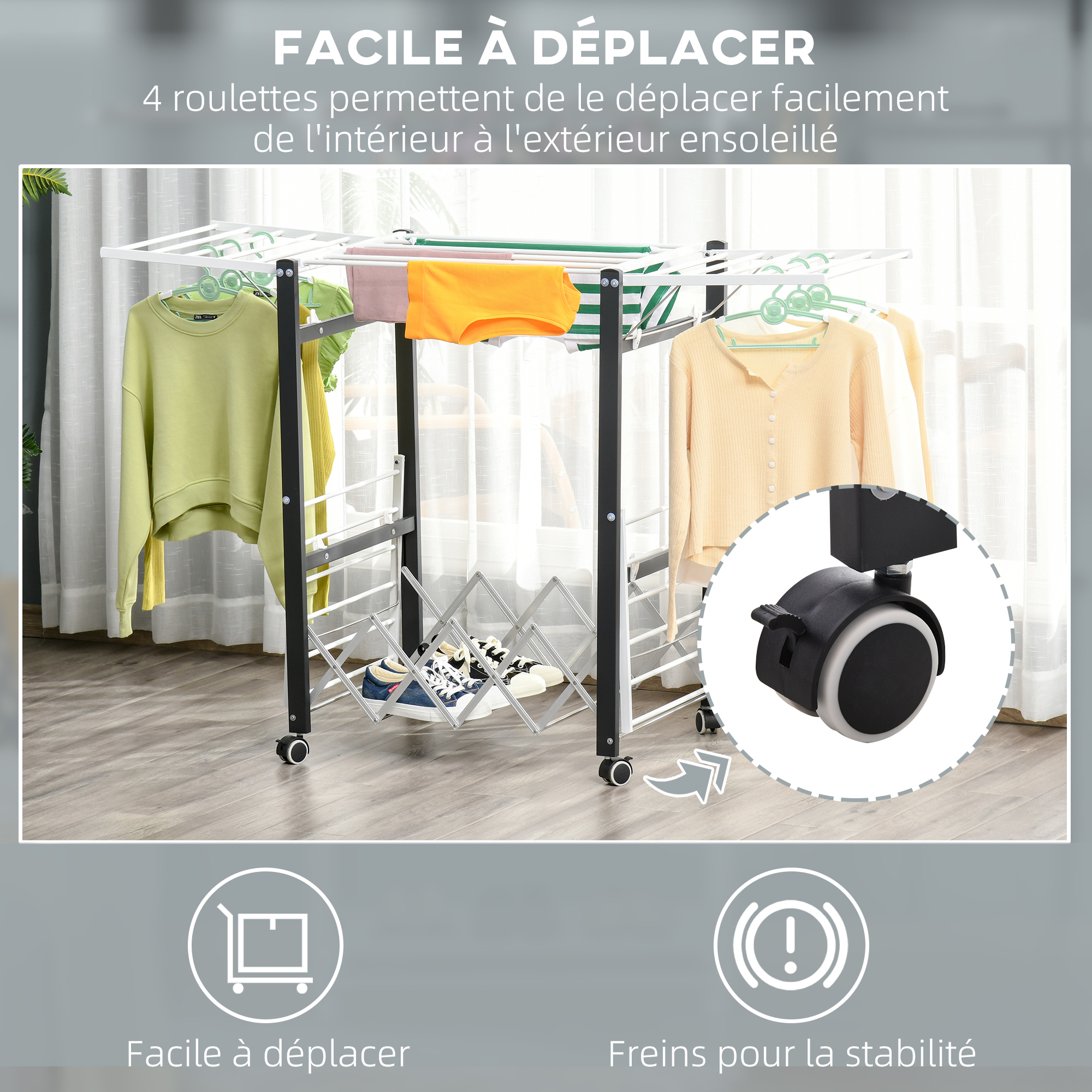 Cet ingénieux séchoir à linge pliable vous facilitera grandement la vie ! Vous pourrez à votre guise sécher et ranger une bonne partie de vos vêtements comme vous le souhaitez. Grâce aux roulettes, vous pourrez déplacer le séchoir à linge extérieur comme vous le souhaitez.