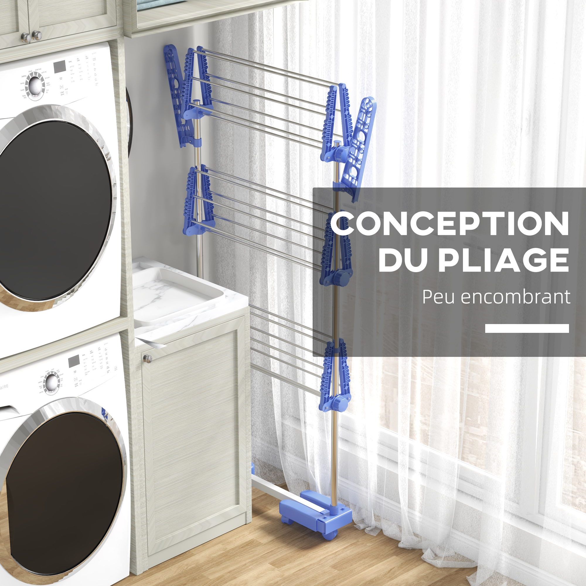 Séchoir à linge étendoir pliable ailes latérales 3 niveaux acier inox PP bleu