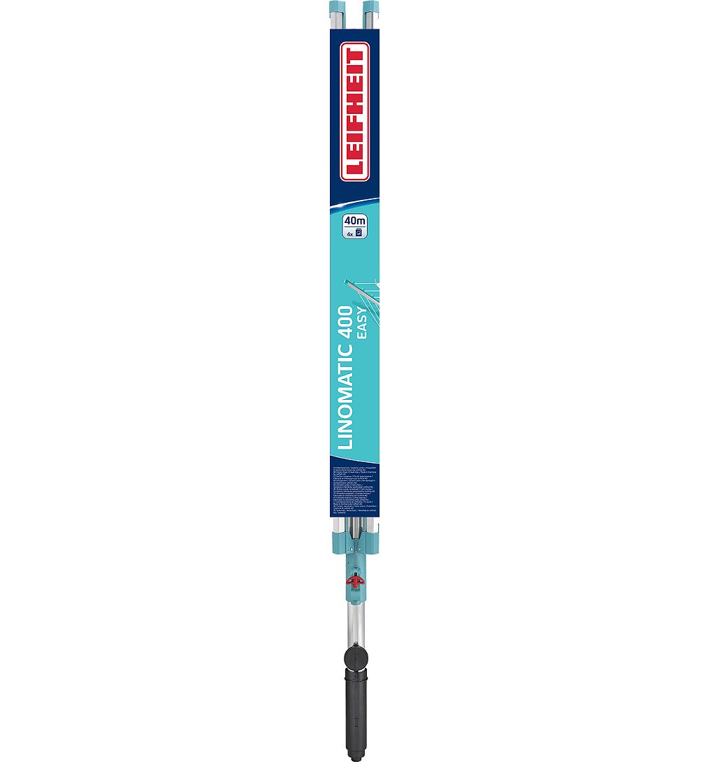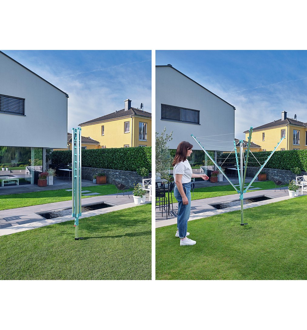 › Longueur d'étendage : 40 mètres › Coloris : turquoise/gris › Longueur des fils extérieurs : 1,86 m / Diagonale : 3,03 m › Remplissages : environ 4 machines › Retrait automatique des fils dans les bras à l'abri de la pluie et de la saleté = Fils propres = Linge propre › Ouverture facile avec un cordon › Mât en aluminium anodisé de Ø 50mm de diamètre › Vendu avec une douille de fixation (modèle en plastique) › Made in Germany › Garantie 3 ans
