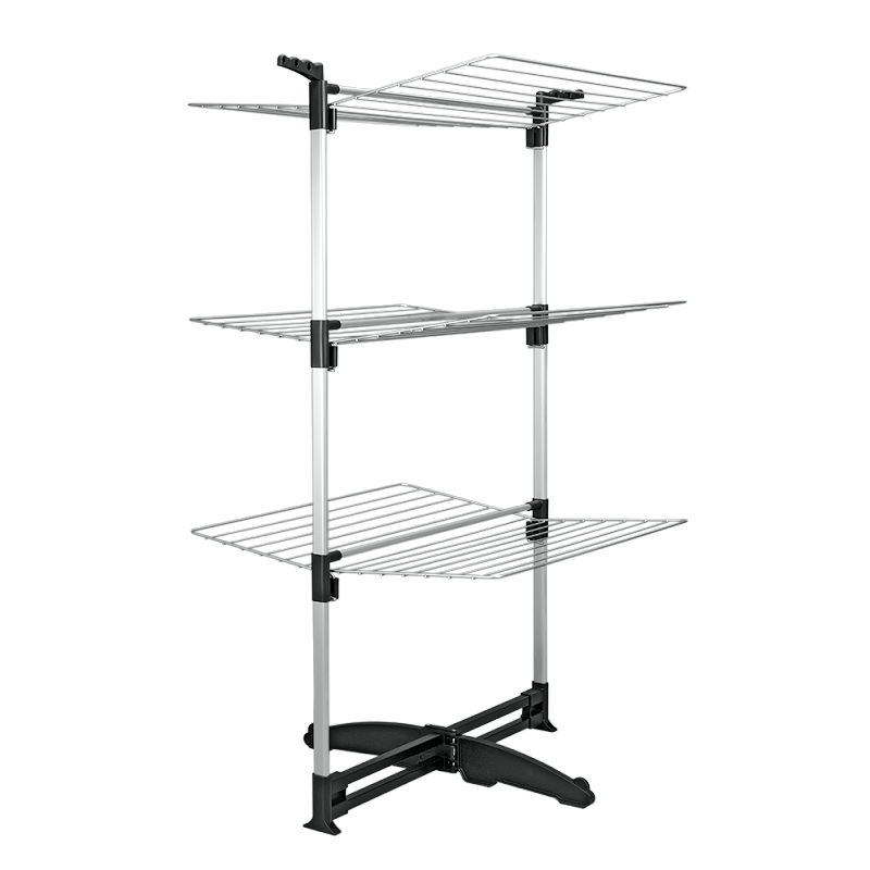 Séchoir tour 3 niveaux CICLONE 40m aluminium- epotherm coloris SILVER traitement EPOTHERM en métal anodisé aluminium pieds composés de 2 barres en acier assurant la stabilité du séchoir, avec 2 porte-cintres pivotants. Modulable, le séchoir est muni de grilles indépendantes pour permettre l’étendage de draps, rideaux, etc
