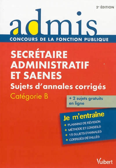 Secrétaire administratif et Saenes Sujets d'annales corrigés Un entraînement approfondi aux épreuves écrites et orale avec : . Des plannings de révision . Une méthode pas à pas pour aborder sereinement les épreuves . Des sujets d'annales 2012 et 2011 avec corrigés détaillés . Des conseils pour l'épreuve orale + 2 sujets d'annales gratuits sur www.concours.vuibert.fr Je m'entraîne Les épreuves d'admissibilité ¤ Cas pratique ¤ QRC (questions communes, gestion des RH, comptabilité et finance, problèmes économiques et sociaux, enjeux de la France contemporaine et de l'UE) L'épreuve d'admission ¤ Entretien avec le jury
