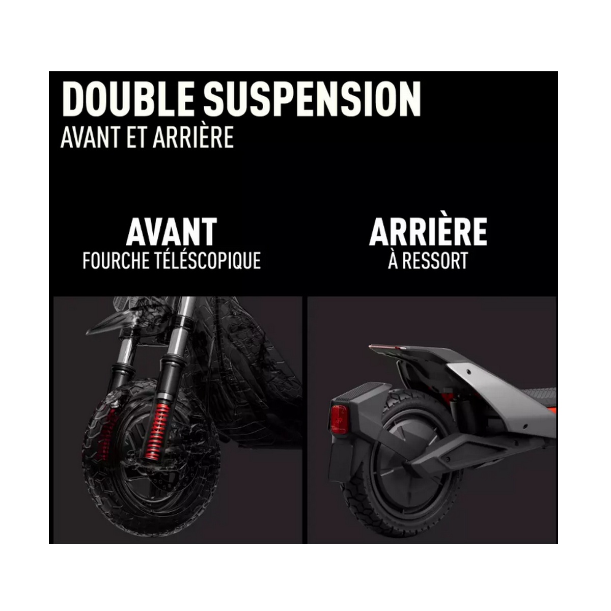 La ZT3 Pro E, équipée d'une double suspension télescopique à l'avant et d'une suspension à ressort à l'arrière, est conçue pour minimiser l'impact des obstacles tels que les pavés, les nids-de-poule et les chemins de gravier.