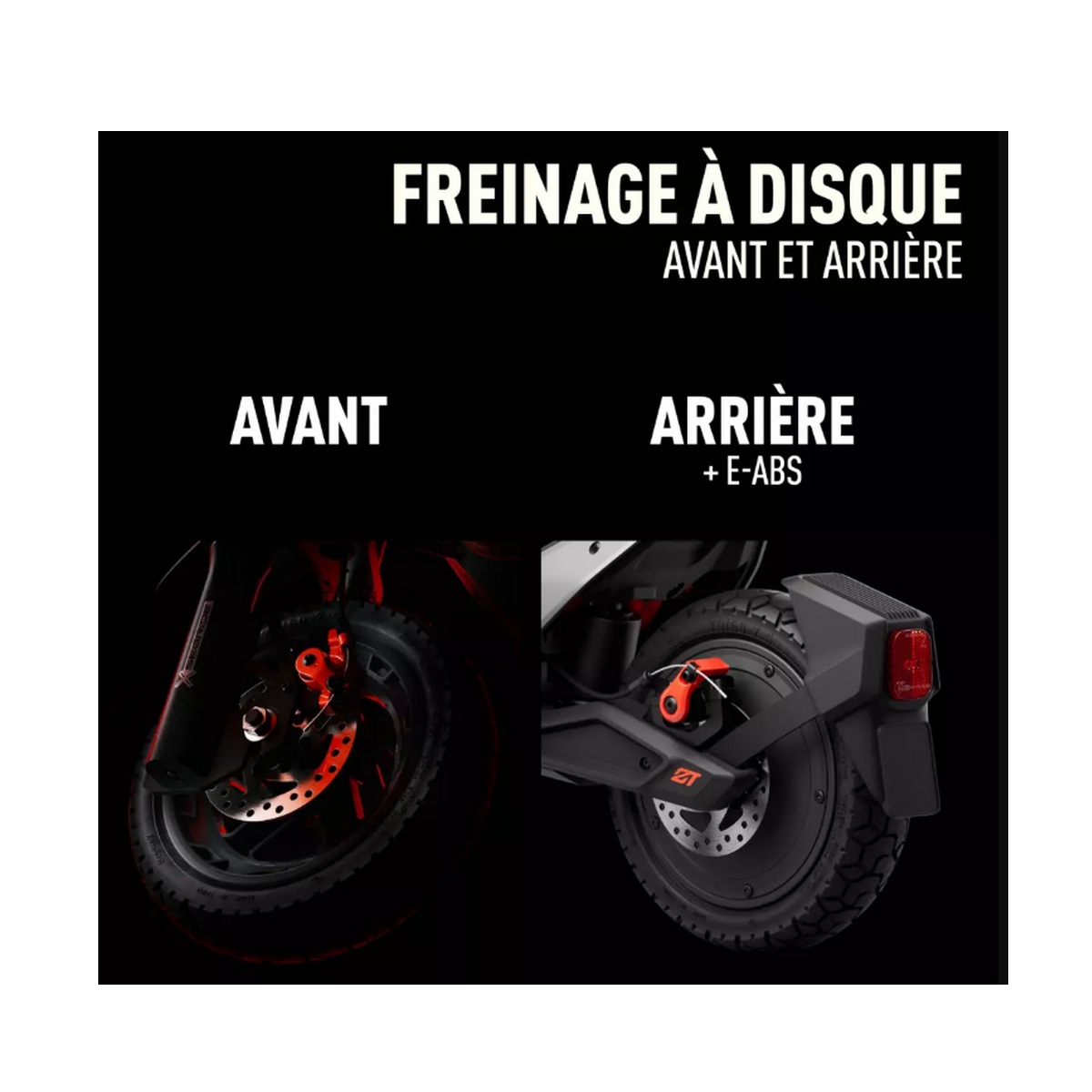 Les freins avant et arrière à disque permettent de contrôler efficacement le freinage et la stabilité de la trottinette.