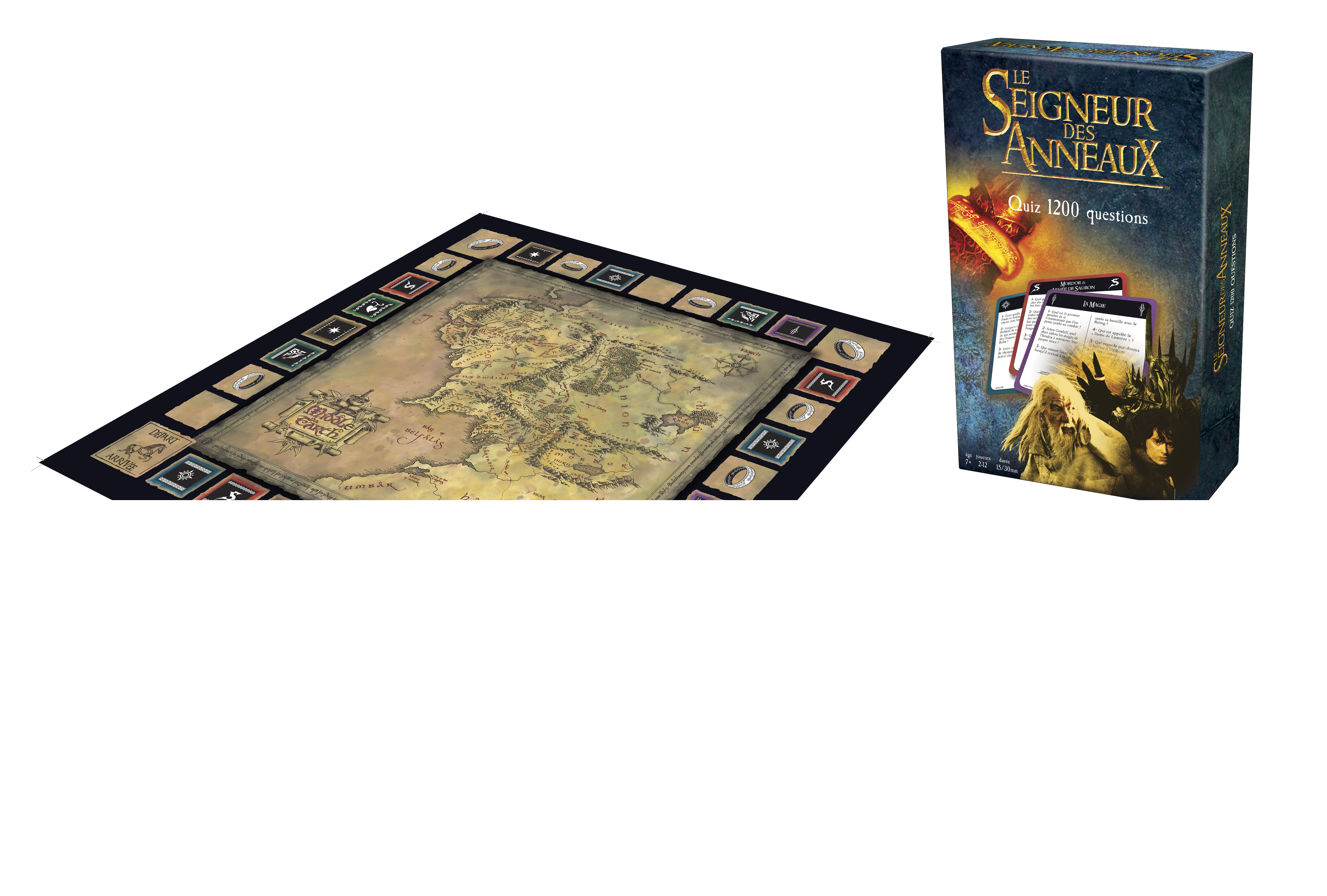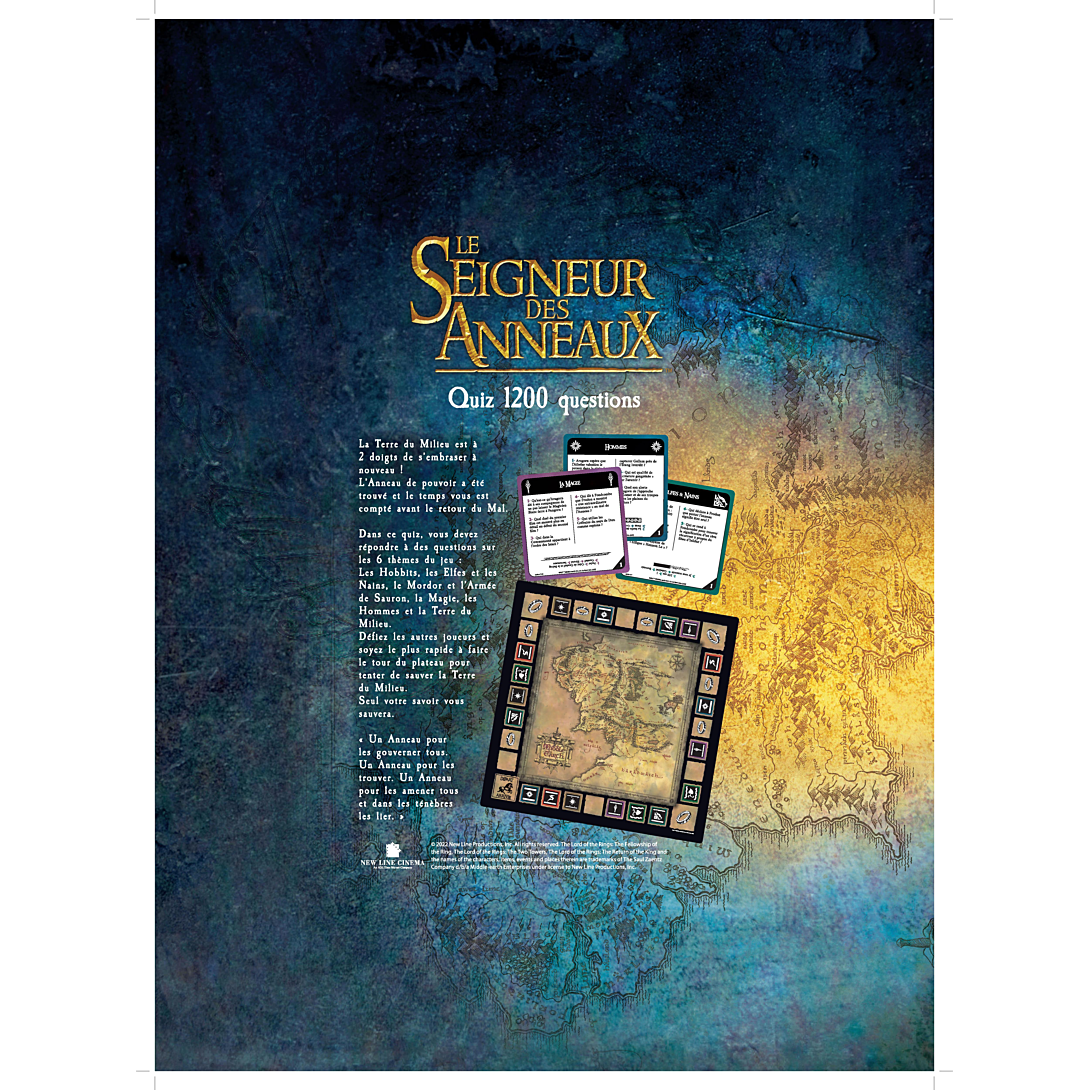 La Terre du Milieu est à 2 doigts de s’embraser à nouveau ! L’Anneau de pouvoir a été trouvé et le temps vous est compté avant le retour du Mal. Dans ce quiz, vous devez répondre à des questions sur les 6 thèmes du jeu : Les Hobbits, les Elfes et les Nains, le Mordor et l’Armée de Sauron, la Magie, les Hommes et la Terre du Milieu. Défiez les autres joueurs et soyez le plus rapide à faire le tour du plateau pour tenter de sauver la Terre du Milieu. Seul votre savoir vous sauvera. « Un Anneau pour les gouverner tous. Un Anneau pour les trouver. Un Anneau pour les amener tous et dans les ténèbres les lier.