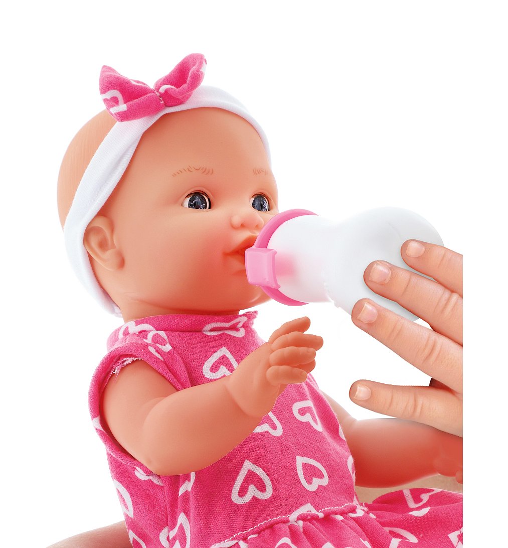 Poupon de 40cm qui boit et fait pipi avec sa baignoire et ses 6 accessoires.