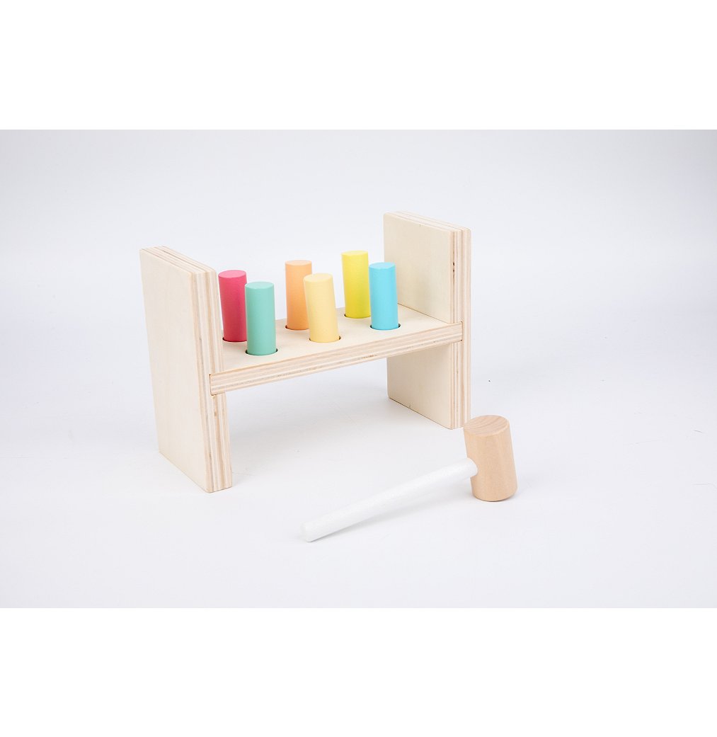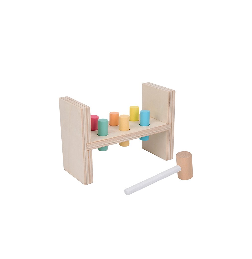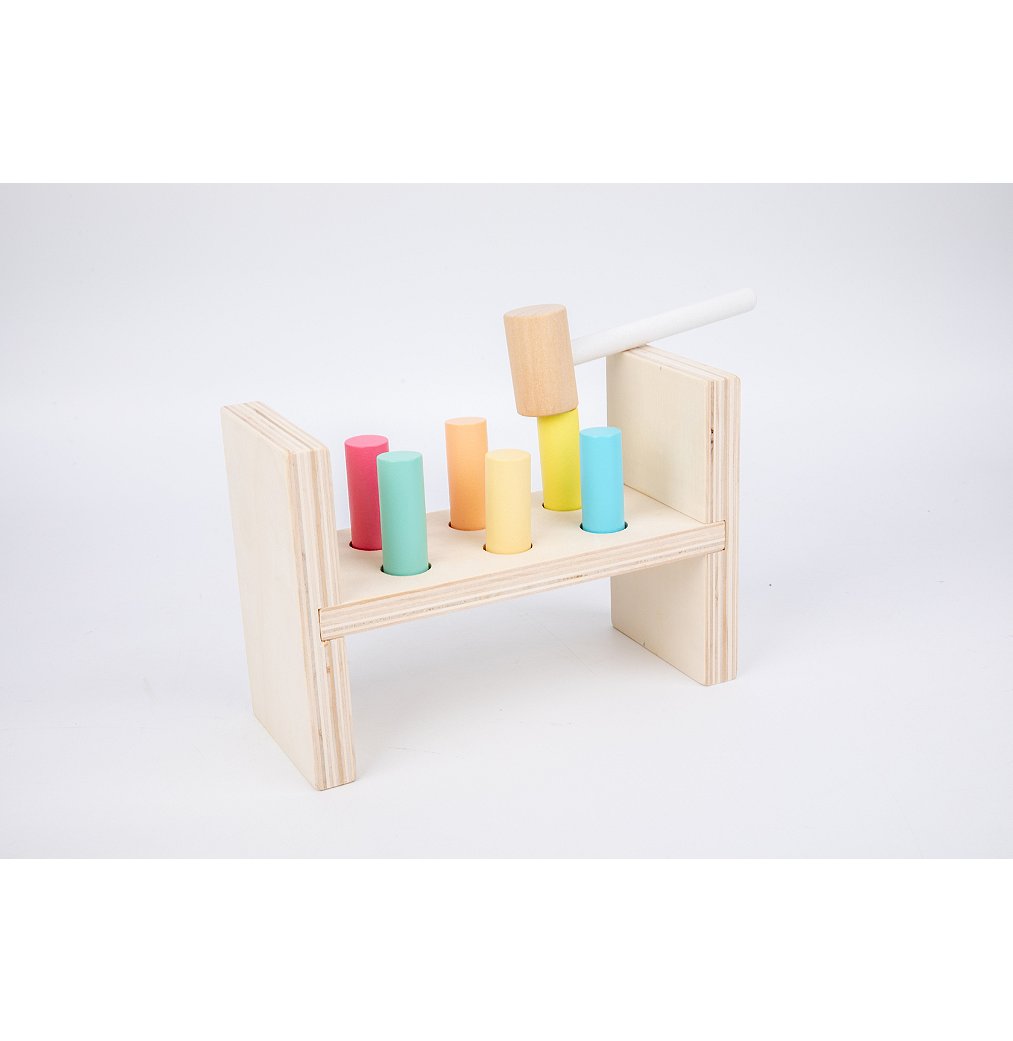 Passer le carrousel d'imagesUn banc avec six cylindres colorés. Avec le marteau, l’enfant doit frapper au bon endroit.