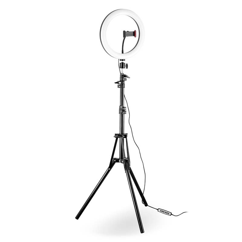 Ajustez votre trépied professionnel avec anneau lumineux multicolore jusqu'à 1.6m de haut. Ensuite branchez le n'importe où, grâce à son câble d'alimentation USB de 2 mètres de long. Installez votre smartphone sur le support. Choisissez entre les 9 modes d'éclairage dont le mode RVB qui contient 15 couleurs et le mode normal qui contient 3 couleurs de lumière (blanche, chaude, douce) grâce à sa télécommande ou son contrôleur USB, qui règlent aussi l'intensité de la lumière (10 niveaux d'intensité de lumière), puis choisissez l'orientation de la lampe (rotation à 360°). Il ne vous reste plus qu'à prendre la télécommande Bluetooth et prendre la pose (jusqu'à 10m de distance) pour réaliser votre selfie (ou vidéo).