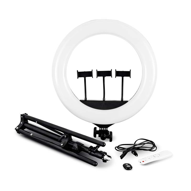 | Plus produit | Trépied professionnel avec anneau lumineux réglable jusqu'à 2m de haut, avec 3 supports de smartphone et une télécommande Bluetooth avec distance effective de 10m |