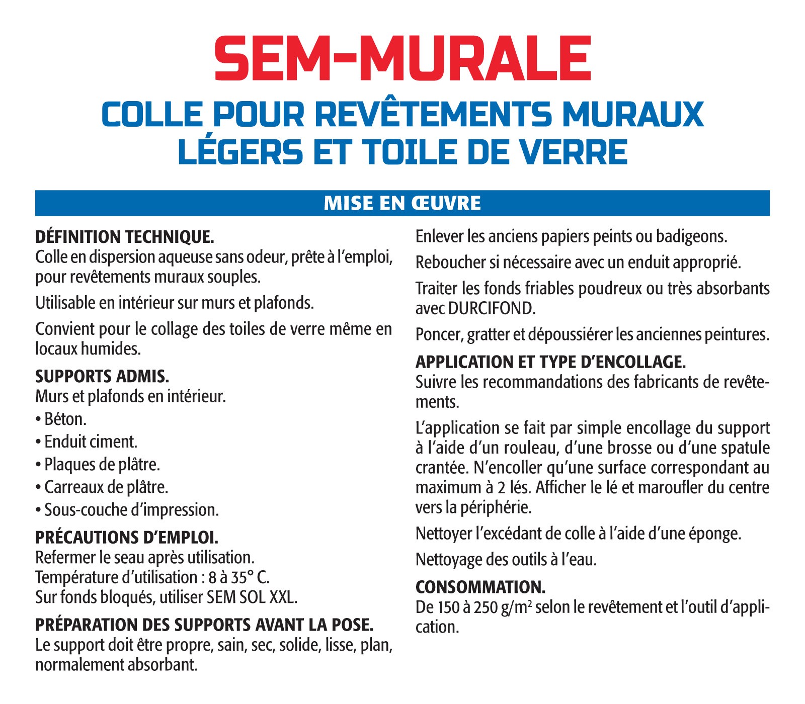 Colle-résine en émulsion prête à l’emploi, SEM-MURALE convient pour la mise en oeuvre de tous les revêtements muraux souples, ainsi que pour le collage de la toile de verre, même en milieu humide.