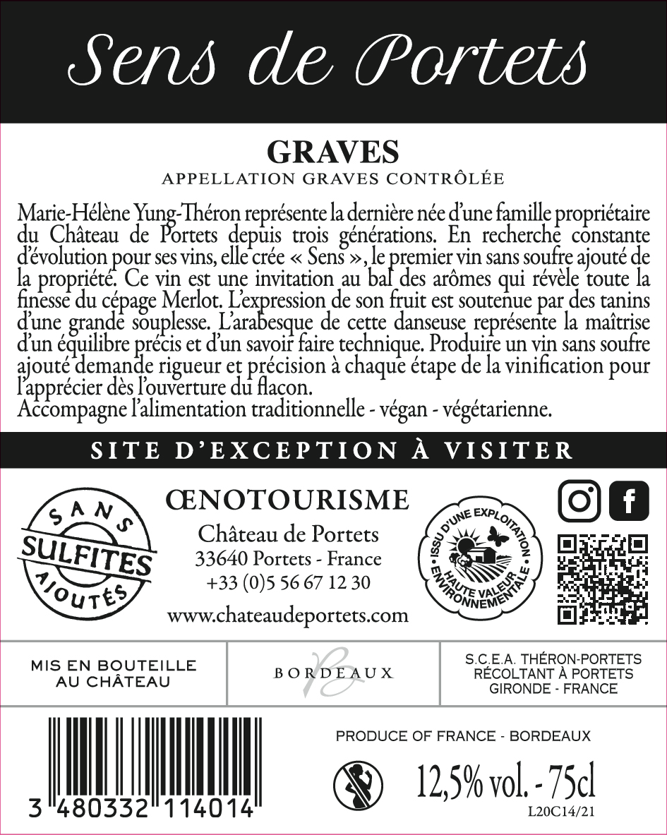 | Libellé | Sens du Château de Portets, 2020 - Graves AOP - Rouge - 75 cl |