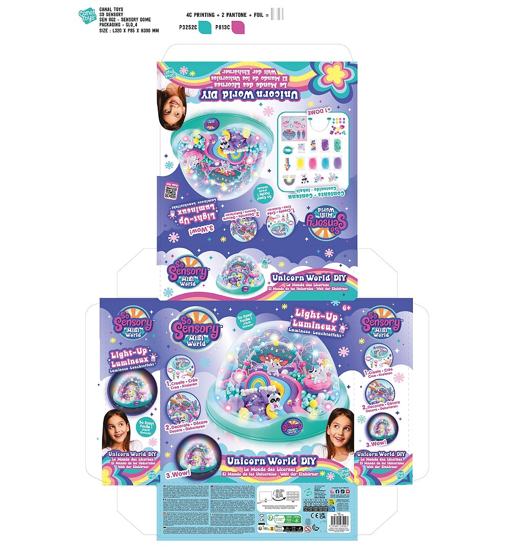Amuse-toi à créer ton propre monde sensoriel sur le thème des licornes et des arc-en-ciel ! A l'intérieur, tu as tout ce qu'il faut pour créer un mini univers coloré. Le dôme est équipé d'une guirlande lumineuse. Allume la lumière pour ajouter de la magie à tes créations.