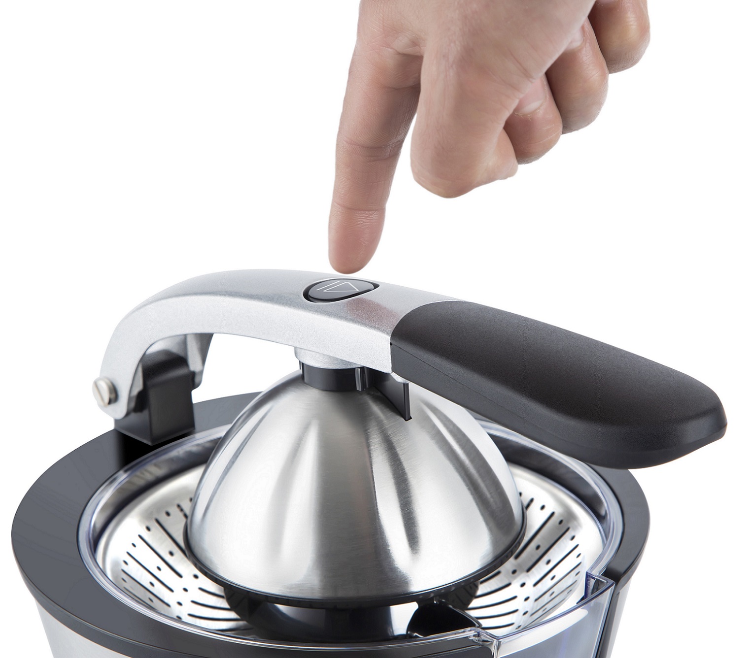 Oranges, citrons ou encore pamplemousses, déposez simplement votre fruit, coupé en 2, sur le cône. Abaissez le bras levier, et laissez le presse agrumes faire le travail. En effet, ce dernier se met en route et s'arrête automatiquement au contact direct de votre fruit. Un vrai jeu d'enfant avec son bras levier !
